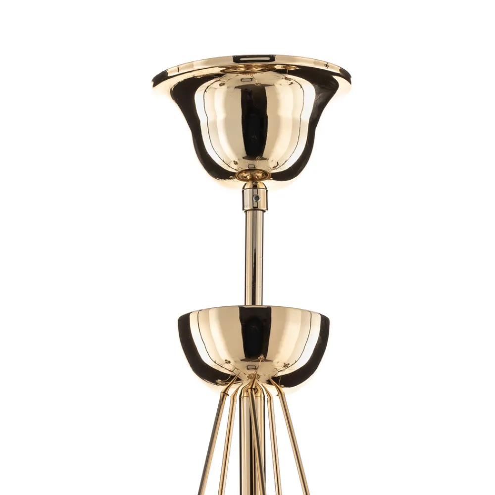 Lysekrone Retro, med fem armer, imponerer med sin elegante gyldne farge og det høykvalitets materialet i stål. Dette tidløse designet passer perfekt inn i stuen og spisestuen og gir hvert rom en luksuriøs atmosfære. De nøye utformede detaljene og den robuste konstruksjonen gjør denne lysekronen til et holdbart høydepunkt i interiørdesignet.