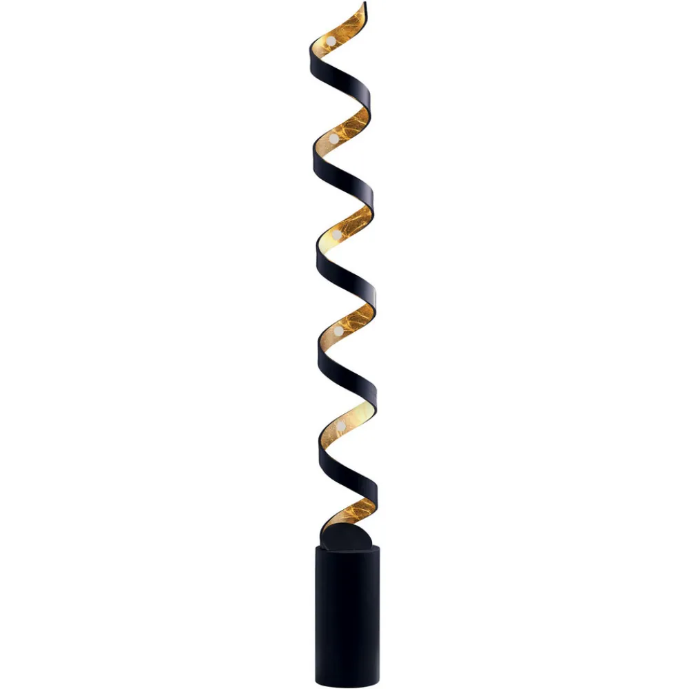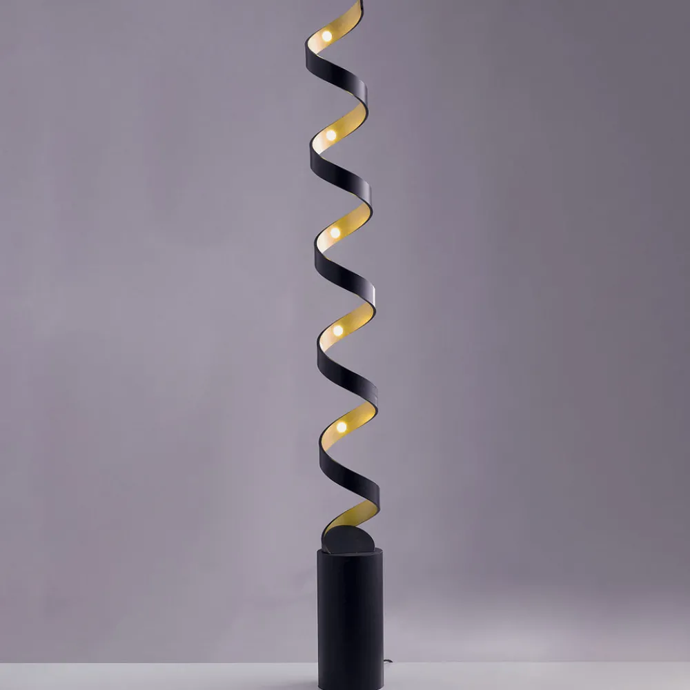 Fra utsiden er spiralen lakkert i myk svart, mens innsiden skinner i gull. Innvendig er det utallige LED-indikatorer som lyser opp innsiden og reflekterer skinnet som en gylden glød. Denne gulvlampen kan kombineres med andre lamper i serien og gi rommet en moderne og edel atmosfære.