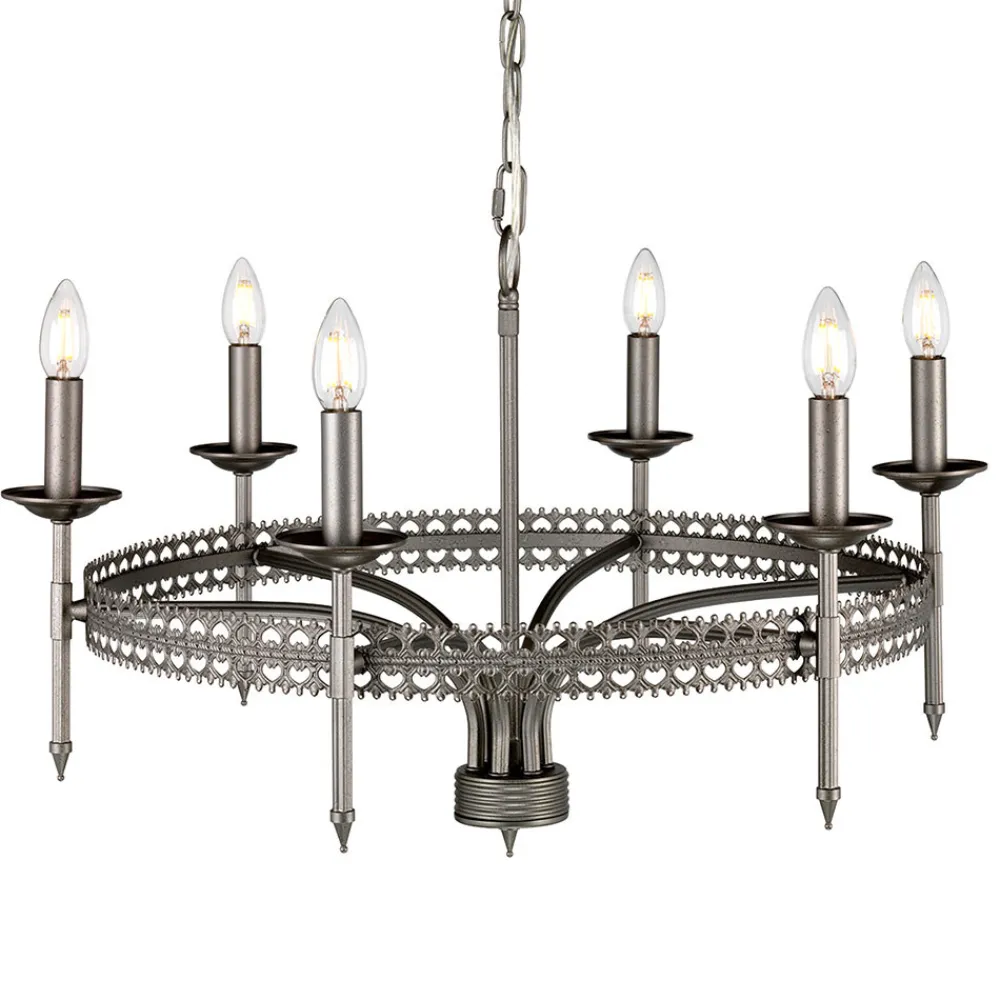 Den dekorative effekten av Crown-lysekronen, inspirert av den kongelige britiske arven, er minst like stor som lyseffekten. Royal insignia finnes i den sekskantede utformingen av rammestagene og i motivene til det omkringliggende metallbåndet, ble den vakre finishen i grått påført for hånd og skiller seg ut takket være den innlemmede vanndråpeeffekten. De seks stearinlysene er ikke jevnt fordelt, men snarere i to grupper på stang , noe som bidrar til det uvanlige utseendet til denne fantastiske lyskilden.