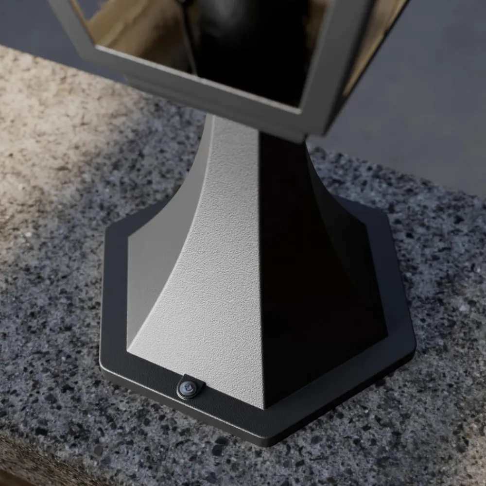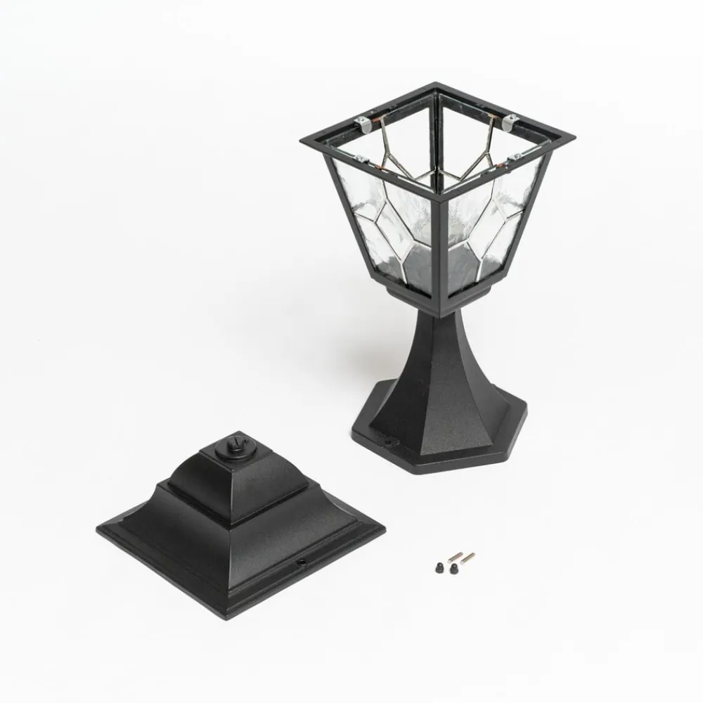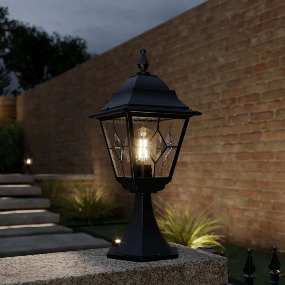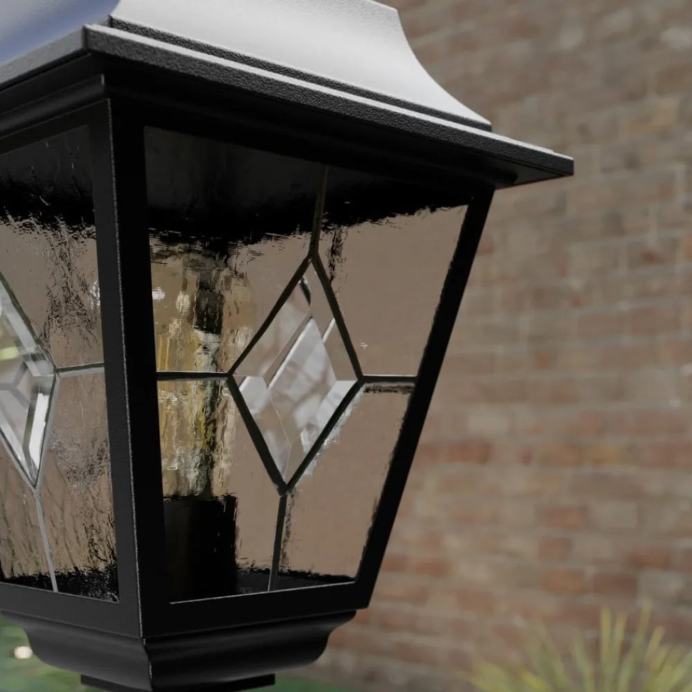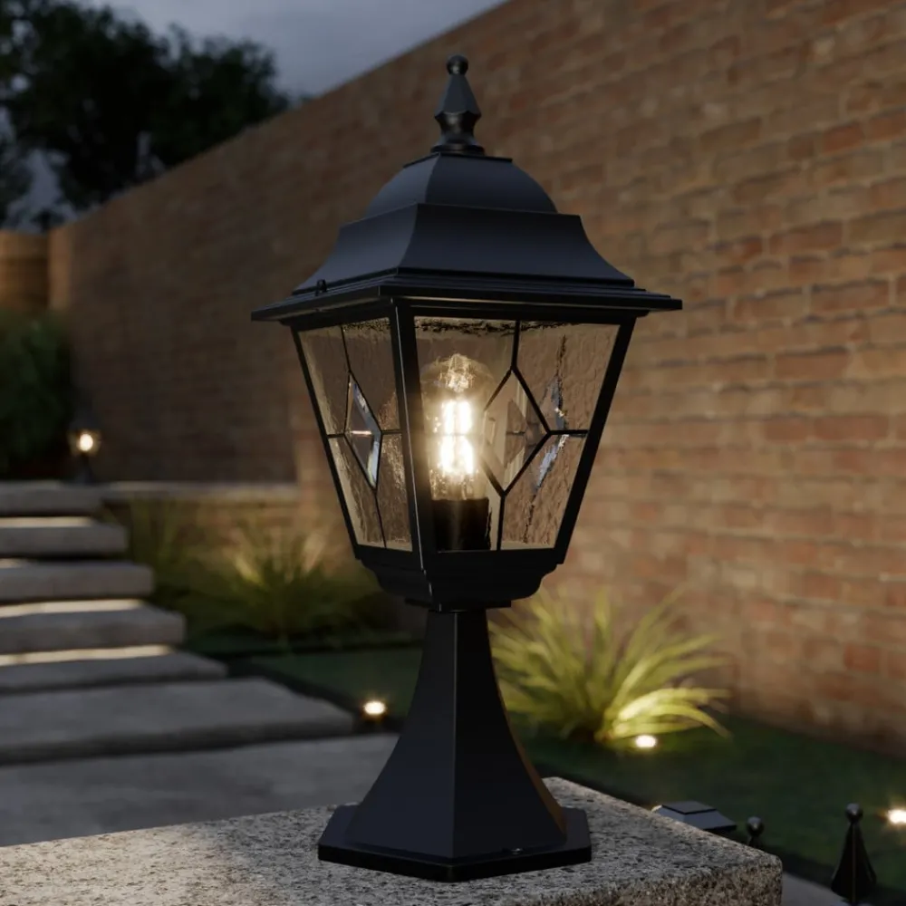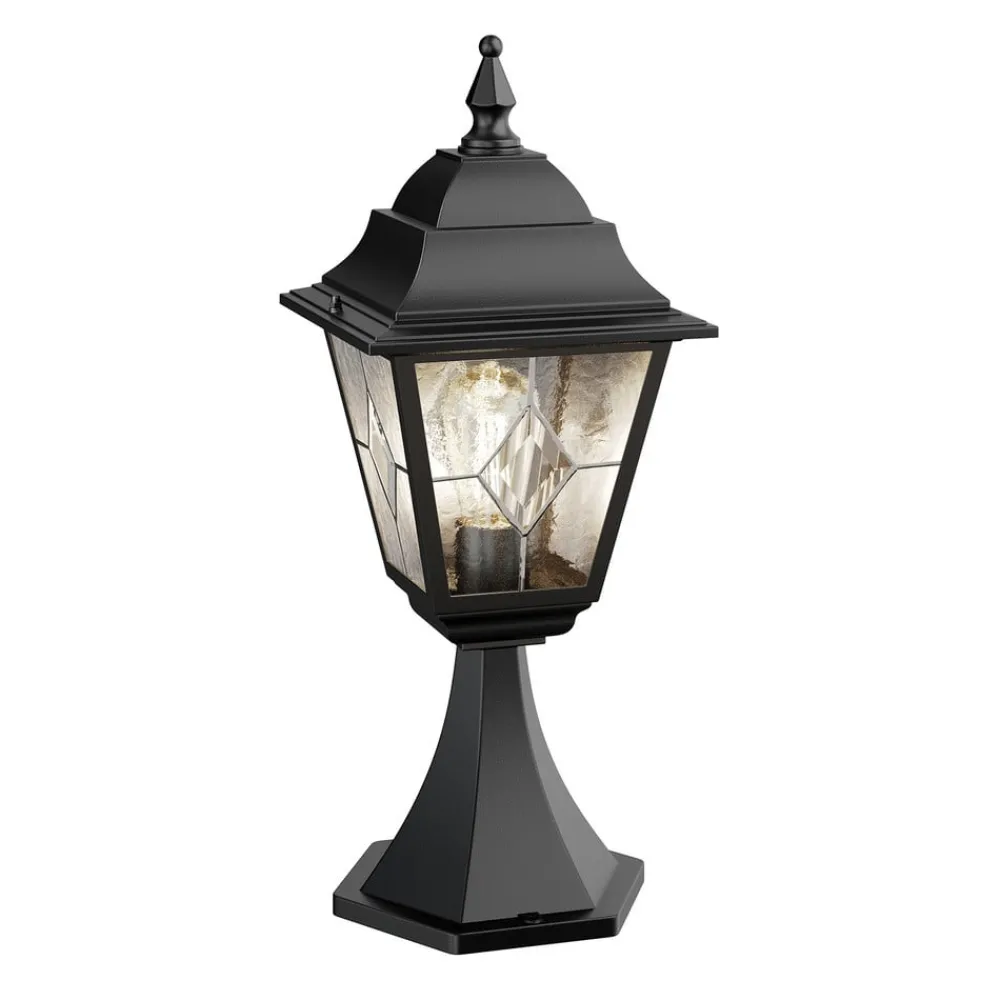 Parker og anlegg rundt herskapelige bygninger forsørges via den stilig lakkerte sokkellampen Norfolk med lys, og blir samtidig dekorert. Den svarte sokkellampen i metall oppnår en spesiell effekt ved de fire sidene på skjermen som er blyinnfattet for hånd, og som hver især består av fem enkelte glasskiver med flott struktur. Utrustet med E27-innfatning kan det innsettes alle slags lyspærer i sokkellampen Norfolk, ved siden av lys-og energisparepærer også med ytterst energisparende LED-pærer med lang levetid.