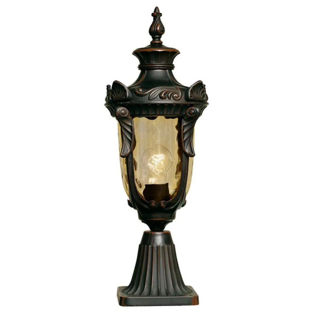 Både fargene – antikk bronse for holderen og fint ravgult for glasset – og formen samt ornamentene minner om gatelyktene i tiden rundt 1900. Med sokkellampen PHILADELPHIA kan man man hente dette preget inn i sin egen hage. Belegget av bronsepatina er påført for hånd.