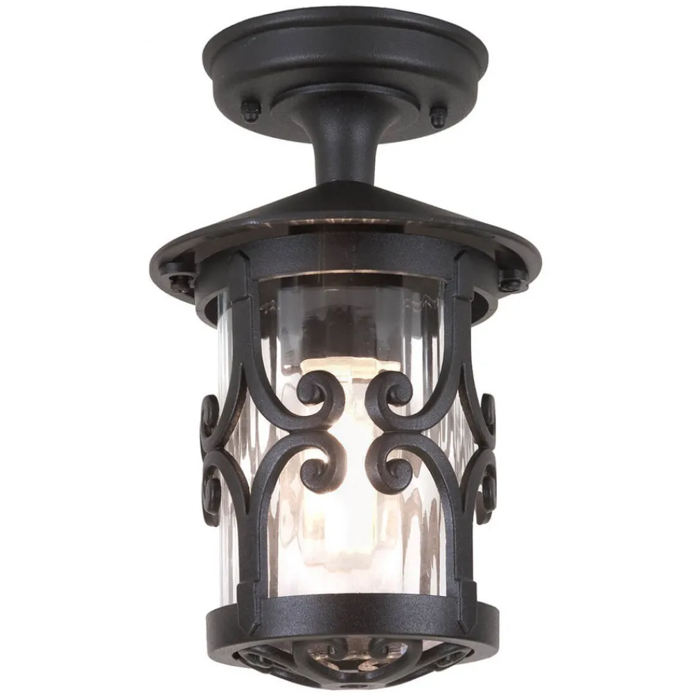 Taklampen Hereford, utformet som en engelsk lanterne, sørger for behagelig belysning på overbygde verandaer, terrasser, i takutstikk etc. Lampen er laget av svært holdbar trykkstøpt aluminium, og den svarte overflaten sammen med det klare glasset passer fint inn i mange ulike uterom. Metalldekoren på skjermen er svært dekorativ og beskytter samtidig glasset.