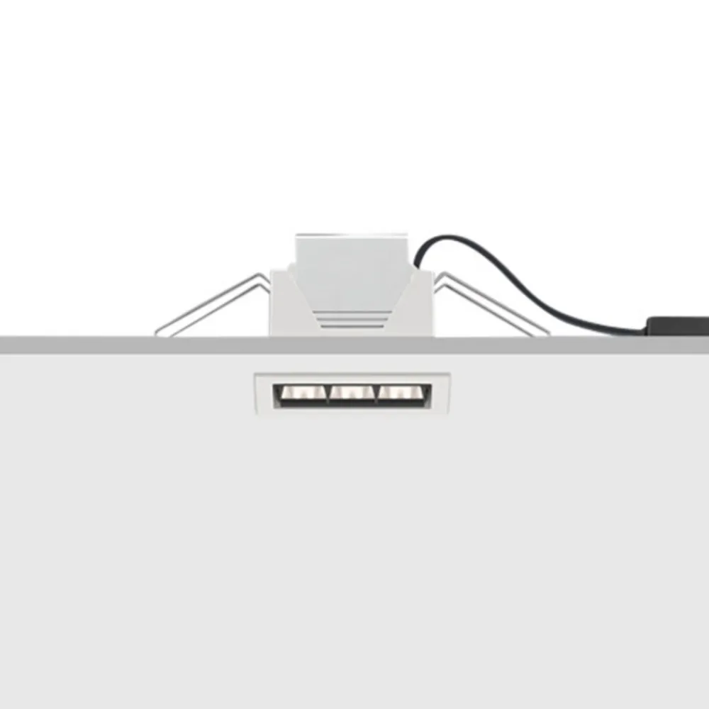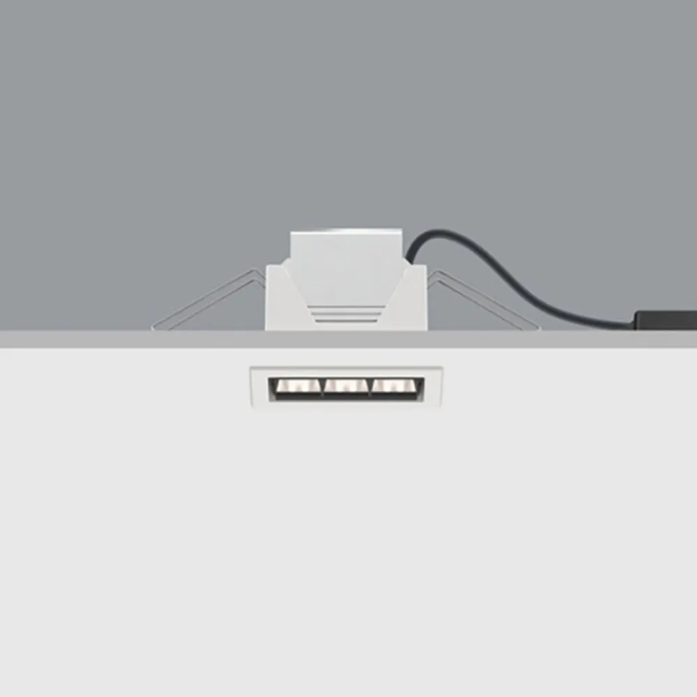 Rektangulær Compar LED-takinnbyggingsarmatur fra ERCO som linsewallwasher, 6 W LED, dimbar via bakkant Enten det er snakk om indirekte belysning via veggen eller belysning av en vareutstilling på siden – Compar LED-takinnbyggingsarmatur er det perfekte valget for bruksområder som krever flatt lys til siden (70° avskjermingsvinkel). Compar er utstyrt med en spesiell Softec linseteknologi for dette formålet. Installasjonsarbeidet minimeres takket være de medfølgende monteringsfjærene, den kompakte Abua-designen, det eksterne forkoblingsutstyret som kan plasseres i ulike posisjoner, og den pluggbare terminaltilkoblingen. Lysutbyttet kan reguleres via en ekstern bakkantfasedimmer – reflektor: plast, sølvdampbelagt, høyspeilende – avblendingsraster: plast, svartlakkert – med dimbart ERCO-reguleringsutstyr – 2-polet plugg-inn-terminal – god fargegjengivelse: Ra 92 – tilkoblet effekt: 9,1 W – aluminiumsprofilhus som kjøleribbe