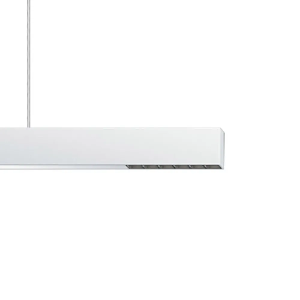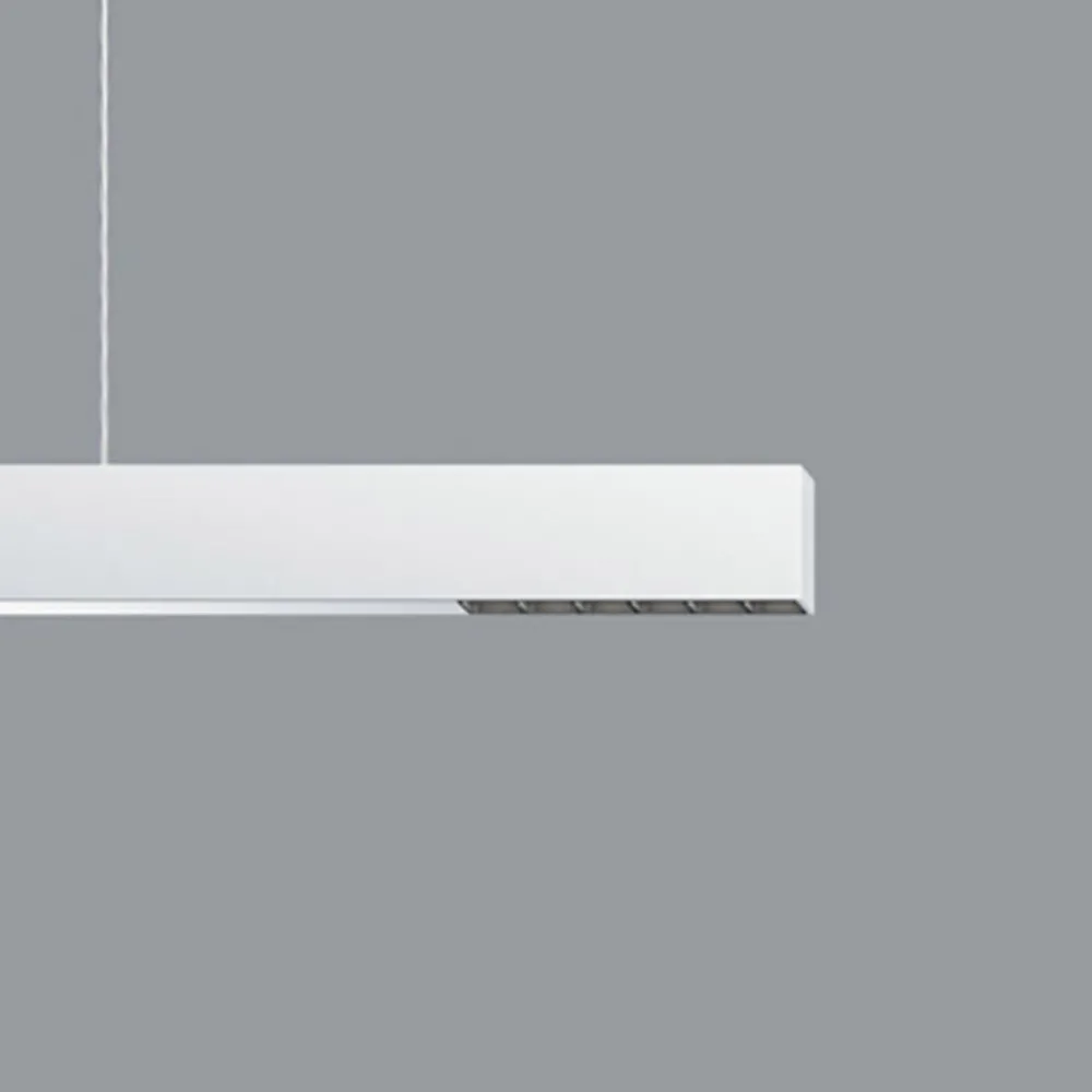 En slank, rektangulær aluminiumsprofil i hvitt pulverlakk danner kroppen til Compar LED-hengelampen. Denne rommer tre separate LED-lyskilder. I de langsgående endene er det to nedoverstrålende brennpunkter, lyset av disse sendes ut gjennom et linsesystem laget av optisk polymer og et dimmende raster med en bred, oval karakteristikk og, takket være den lave blendingseffekten, tilbyr ideell arbeidsbelysning for moderne kontorlokaler. Lyskilden, som lyser oppover, er plassert under en diffusor laget av strukturplast, som sørger for spesielt bred lysspredning og dermed gir indirekte grunnbelysning over taket for et stort område av rommet. Lyseffekten kan reguleres med en ekstern DALI-styring (dimming / kobling for uplight og downlight mulig uavhengig av hverandre).