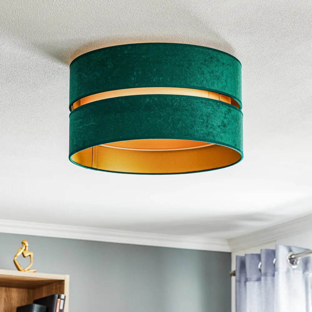 Euluna Duo taklampe kombinerer moderne design med høykvalitetsmaterialer som stoff og PVC for å skape en stilig atmosfære. Kombinasjonen av grønn og gylden farge gir hvert rom et spesielt preg og sørger for en harmonisk atmosfære. Denne lampen er ideell for ulike oppholdsrom som stue, soverom, gang og spisestue, og tilbyr dermed fleksible bruksmuligheter.