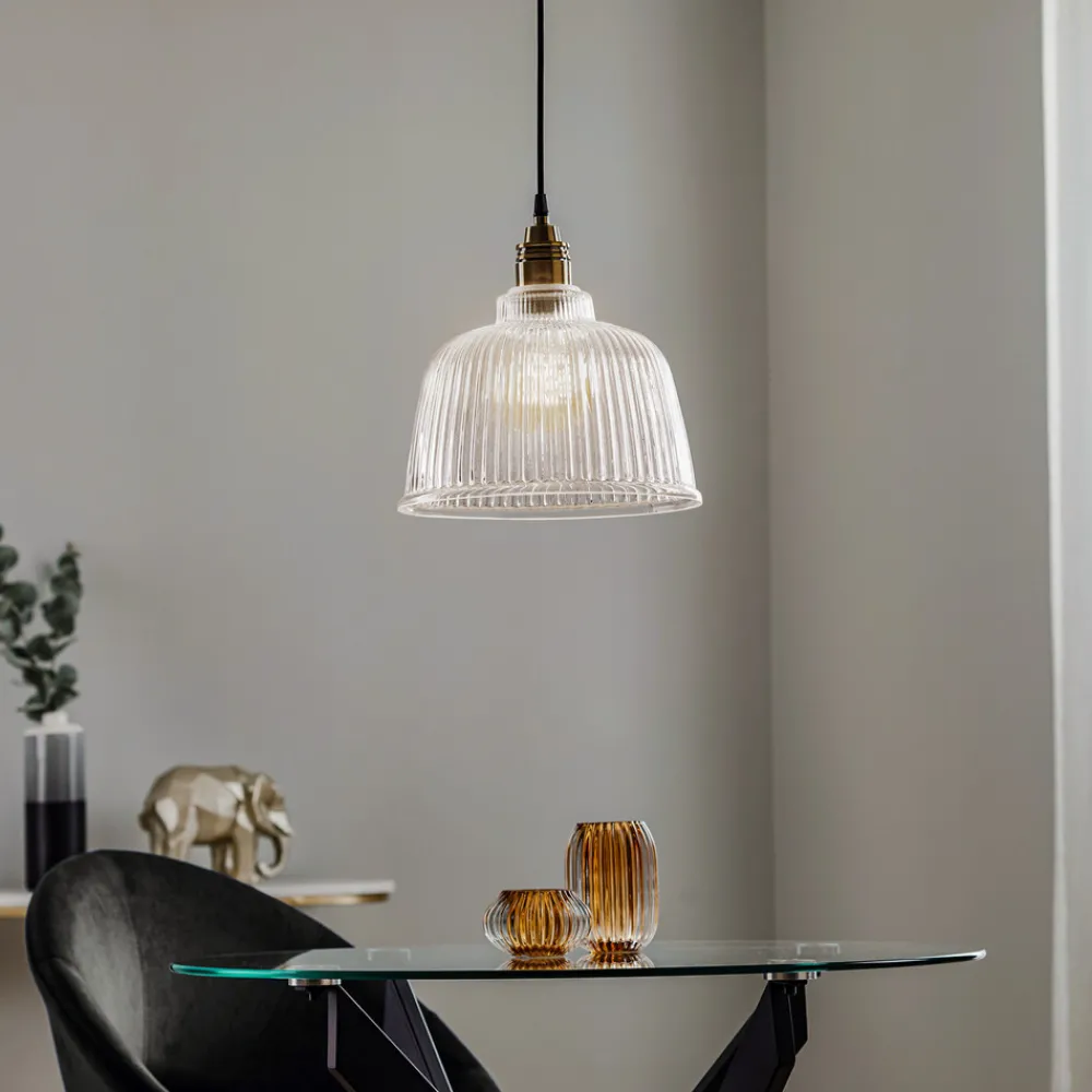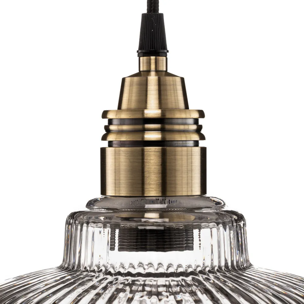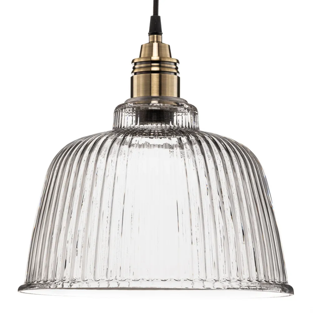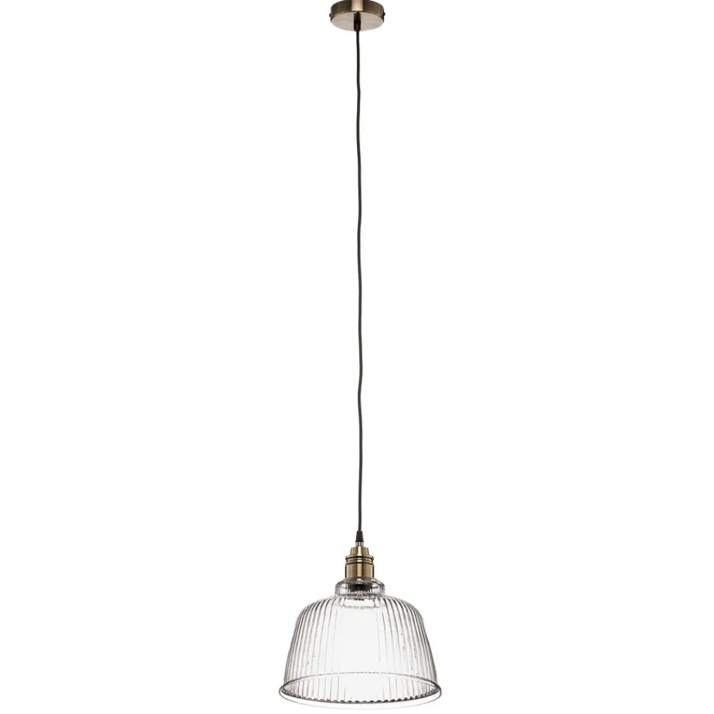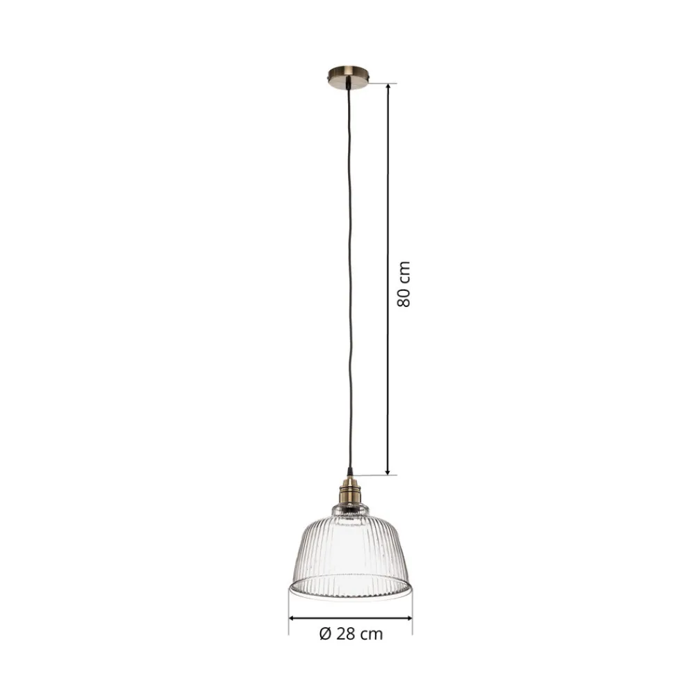 Hengelampen Leana kombinerer tidløs eleganse med funksjonell allsidighet. Den er laget av høykvalitets metall og klart glass og skinner i en edel antikk messingfinish. Denne lampen er ikke bare et blikkfang, men også et godt eksempel på europeisk håndverk, da den er produsert i Polen. Den klare glassstrukturen sørger for optimal lysfordeling, som gir hvert rom en varm og innbydende atmosfære.