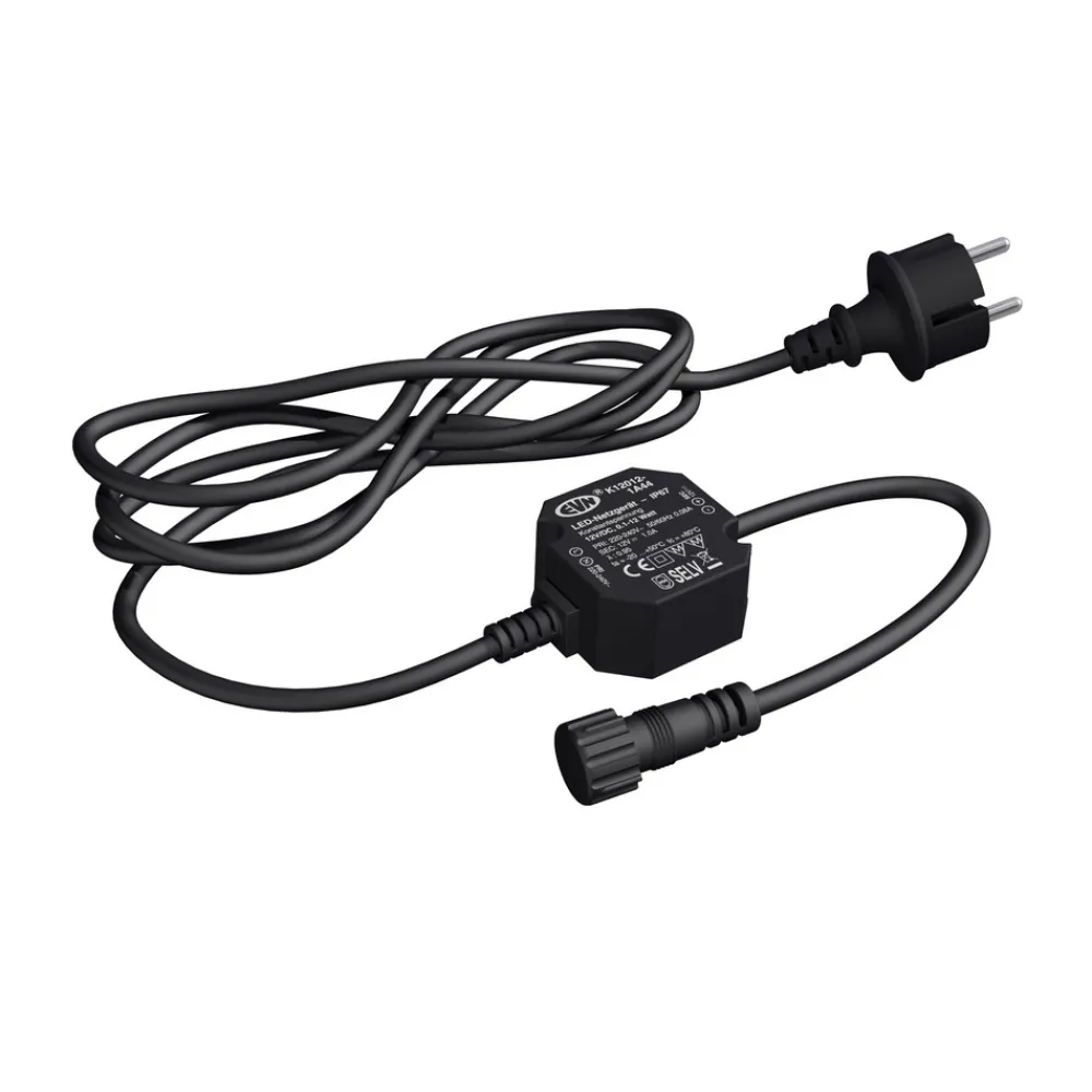 Med LED-strømforsyningsenheten K12012-1A44 fra EVN kan lysene drives med en spenning på 12V/DC. Den er designet for IP44-kontaktsystemet og leveres med en tilsvarende stikkontakt.