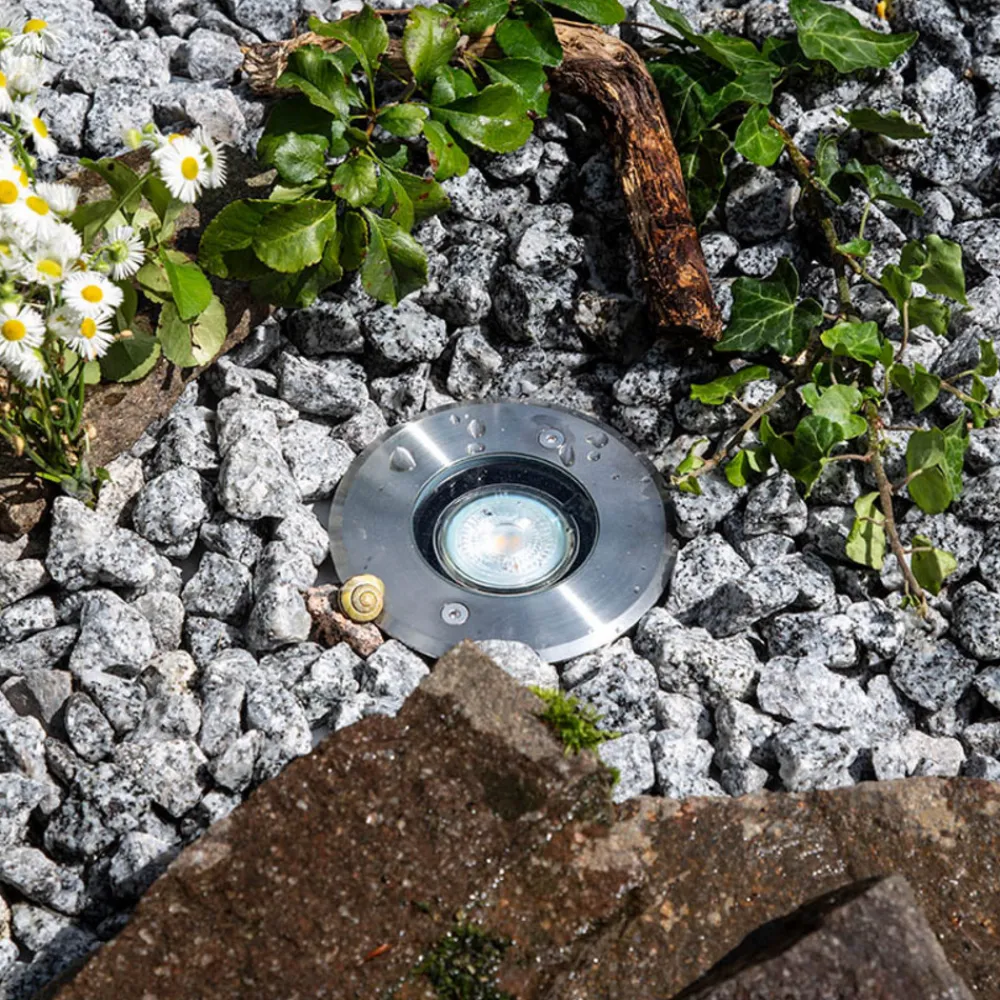 Takket være værbestandigheten (IP67) og belastbarheten på op til 3.500 kg er den nedfelte lampen Talpa det optimale valget for belysning av eiendomsveier og garasjeinnkjørsler. Den kan kjøres over med en maksimal hastighet på 20 km/t. Huset er laget av aluminium, og frontplaten er av V2A-stål. Kabelføringen går gjennom skruene i bunnen av lampen. Kabelen kan ha en diameter på opptil 9 mm. Leveransen inkluderer et klart og et matt beskyttelsesglass. En valgfri innbyggingsboks i plast følger også med. Hvis denne brukes, reduseres innbyggingsdiameteren til 9,6 cm, mens innbyggingsdybden forblir uendret.
