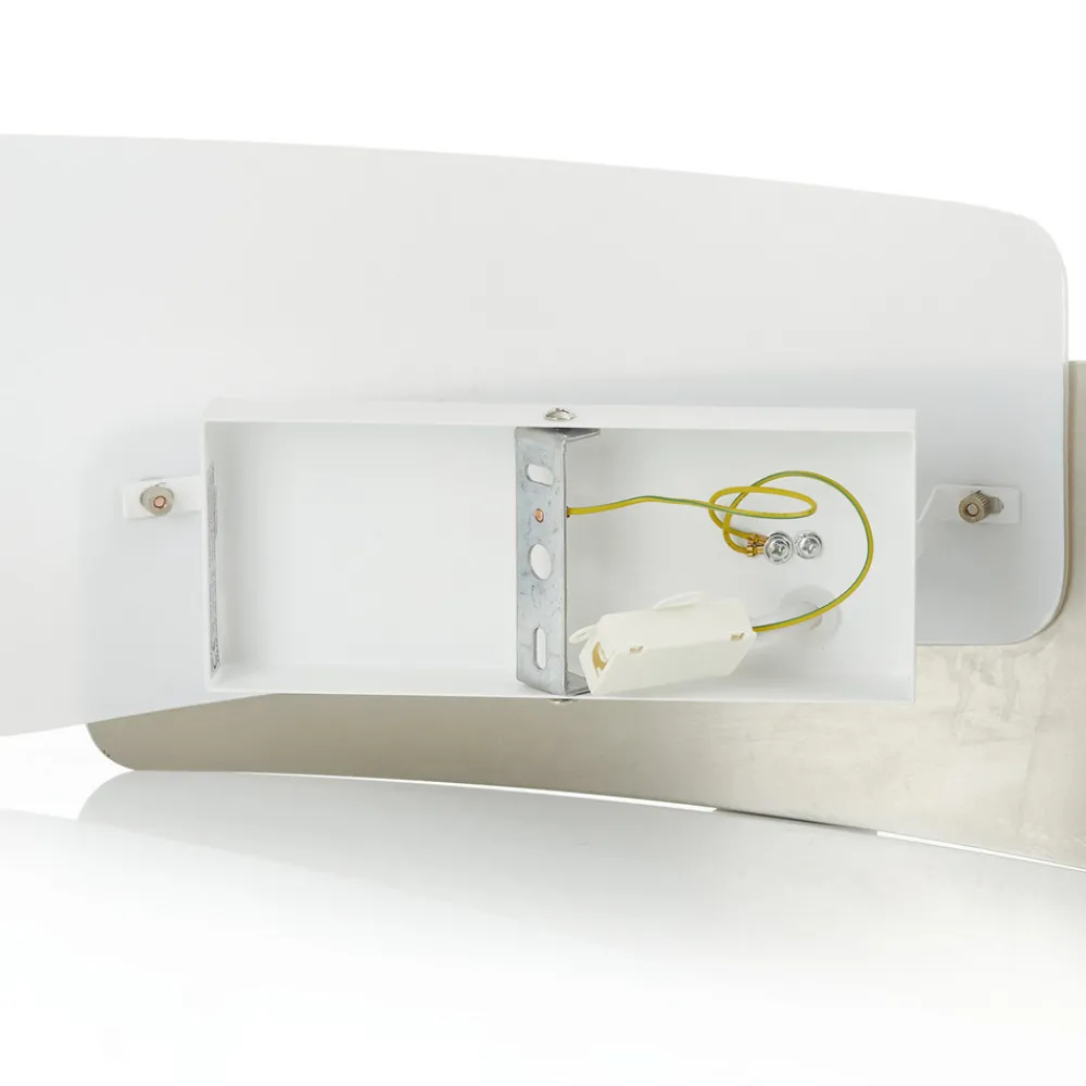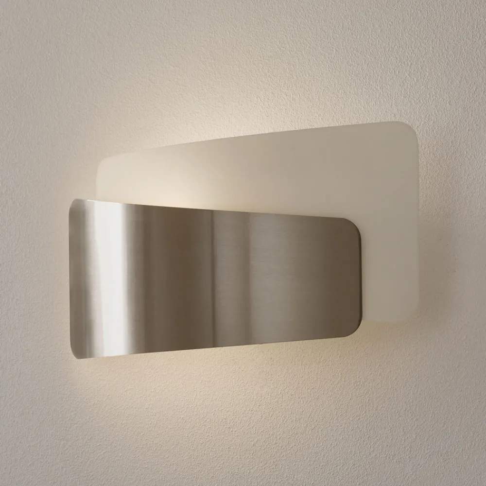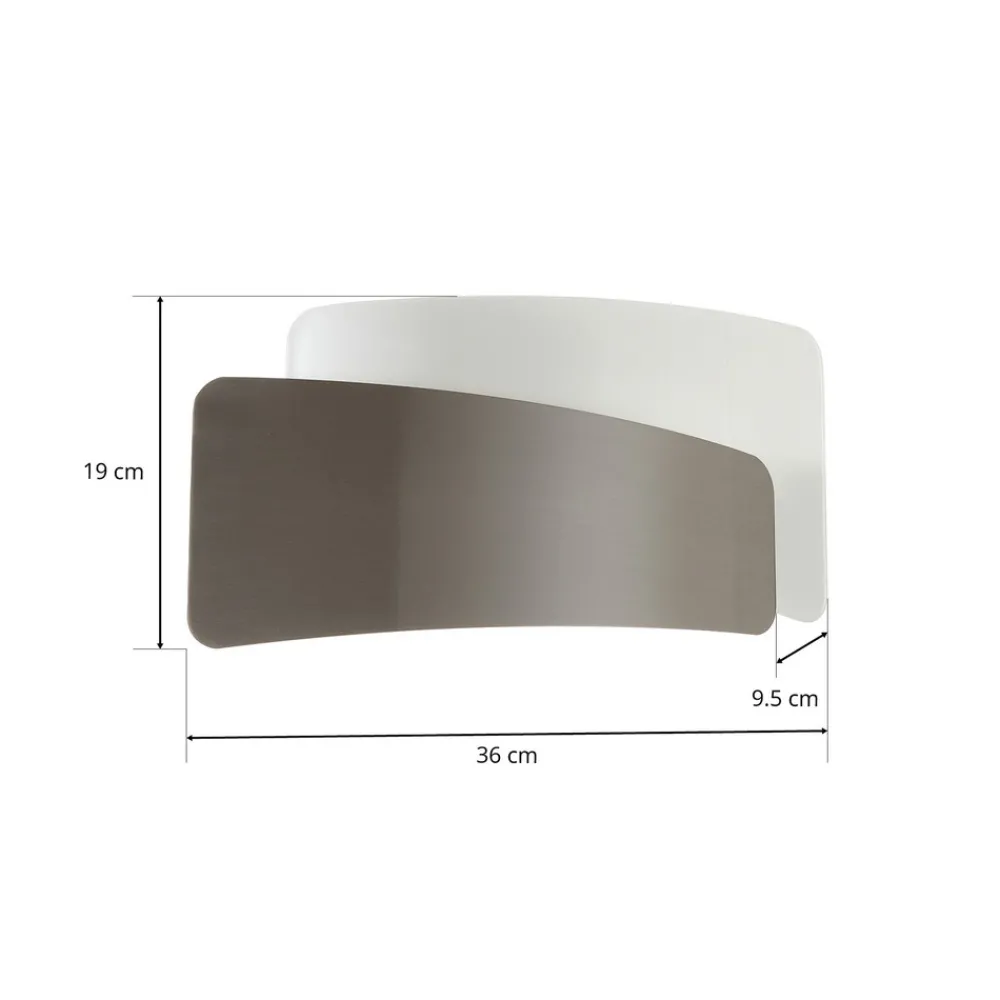 En buet glassplate og et metallelement i samme bueform er montert forskøvet i forhold til hverandre, og skaper lampeskjermen til den moderne vegglampen Slane. Ikke kun formen, også materialkombinasjonen i satinert glass og metall med satinert nikkelfinish gjør at vegglampen blir til et praktstykke, uansett i hvilket rom den plasseres. Den brukes sammen med en E27 lyspære, og oppnår en unik lyseffekt. Passende lyspærer se tilbehør.