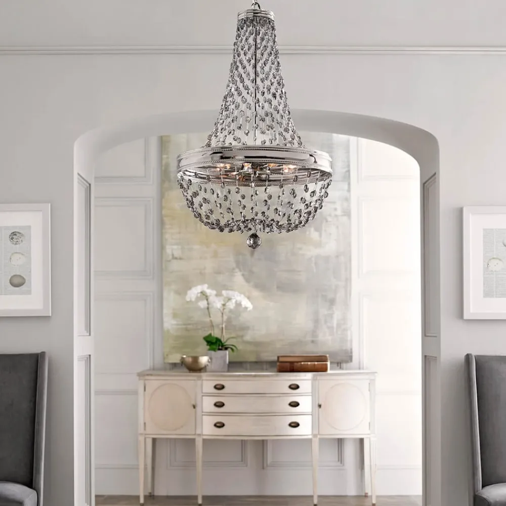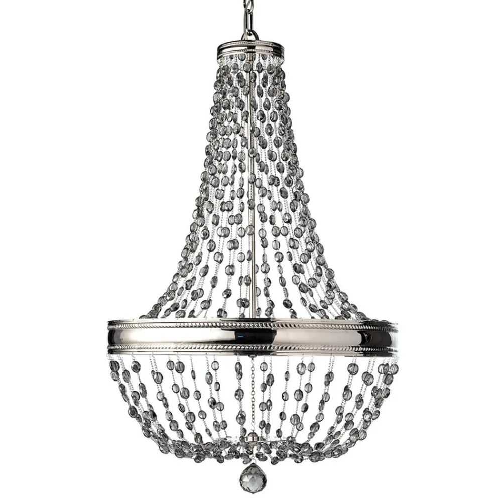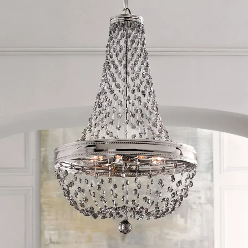 Denne fasinerende utarbeidede lysekronen passer på grunn av sin eleganse både til moderne og tradisjonelt pregede innretningsstiler, og forskjønner det private oppholdsrommet like godt som f.eks. en hotellhall eller en konferansesal. Den klassiske formen dannes ved behenget av utallige, røykfargede dråper av krystallglass. Stellet samt opphenget skinner i polert nikkeltone – et avbalansert ensemble, som utstråler harmoni og ro, og som skaper fantastisk lysglans i ethvert rom.