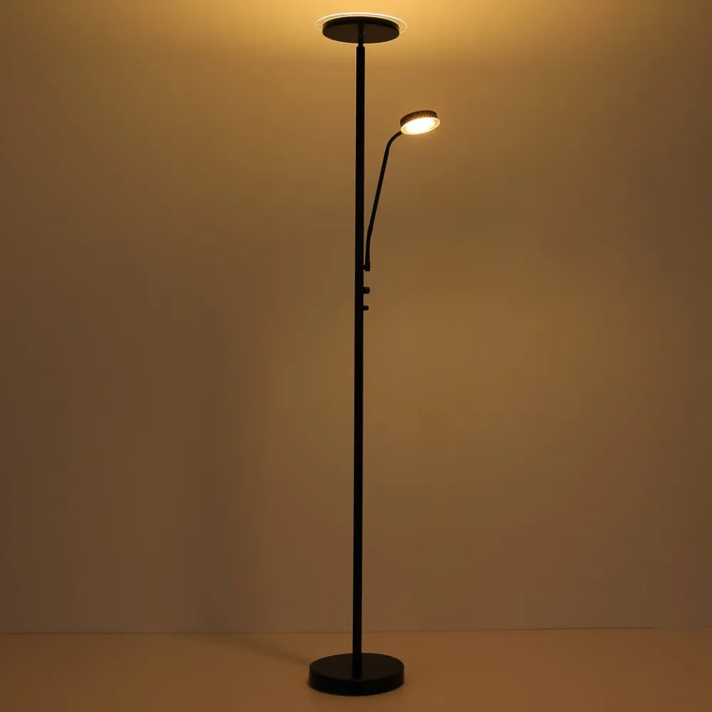 Ernst er en stilig LED-gulvlampe som egner seg spesielt godt til aksentbelysning i en stue. Den står på en rund base hvorfra en slank stang reiser seg, som ender i en smal lampeskjerm . På den ene siden har Ernst en flexarm som en annen lyskilde er festet på og tilbyr et ekstra lys. De permanent installerte lysdiodene i lampeskjermene genererer varmt hvitt lys som er ideelt for innendørs bruk og skaper en harmonisk atmosfære. Den svarte fargen til Ernst LED-gulvlampe runder velvillig av den enkle designen.