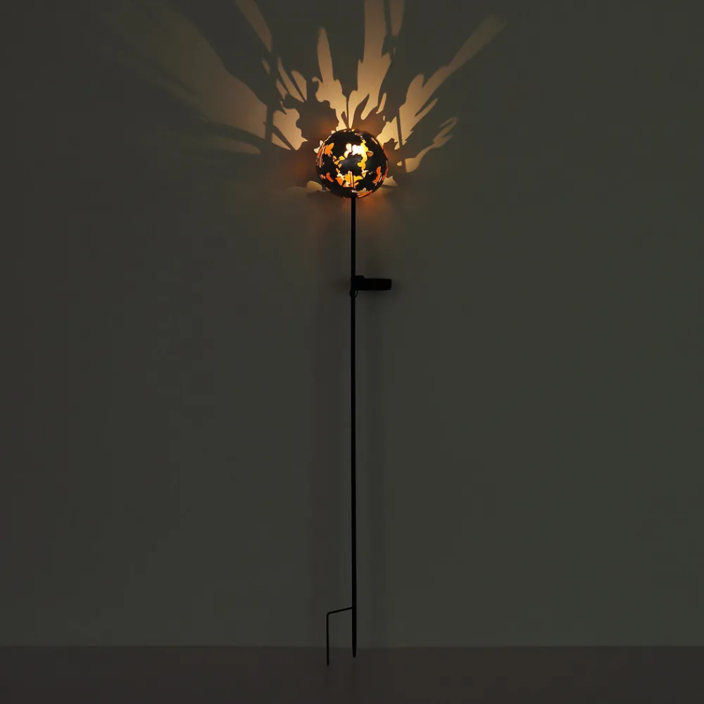 LED-solcellelampe 36747 i kuleform med jordspyd Skjermen på denne solcellelampen med langt jordspyd er designet i form av mange lønneblader som danner en kule. Den varmhvite LED-lampen i kulen skaper flotte lyseffekter.