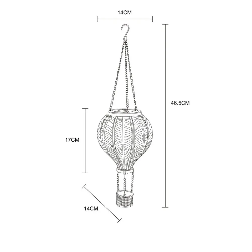 LED-solcellelampe 36136B i luftballongdesign Denne opplyste luftballongen vil fortrylle enhver uteplass eller hage. Den fargerike skjermen i plast er utstyrt med varmhvite LED-lamper på innsiden, som med sin flammeeffekt imiterer ballongens ild. Med kjedeoppheng og krok kan den solcelledrevne lampen plasseres på mange forskjellige måter.