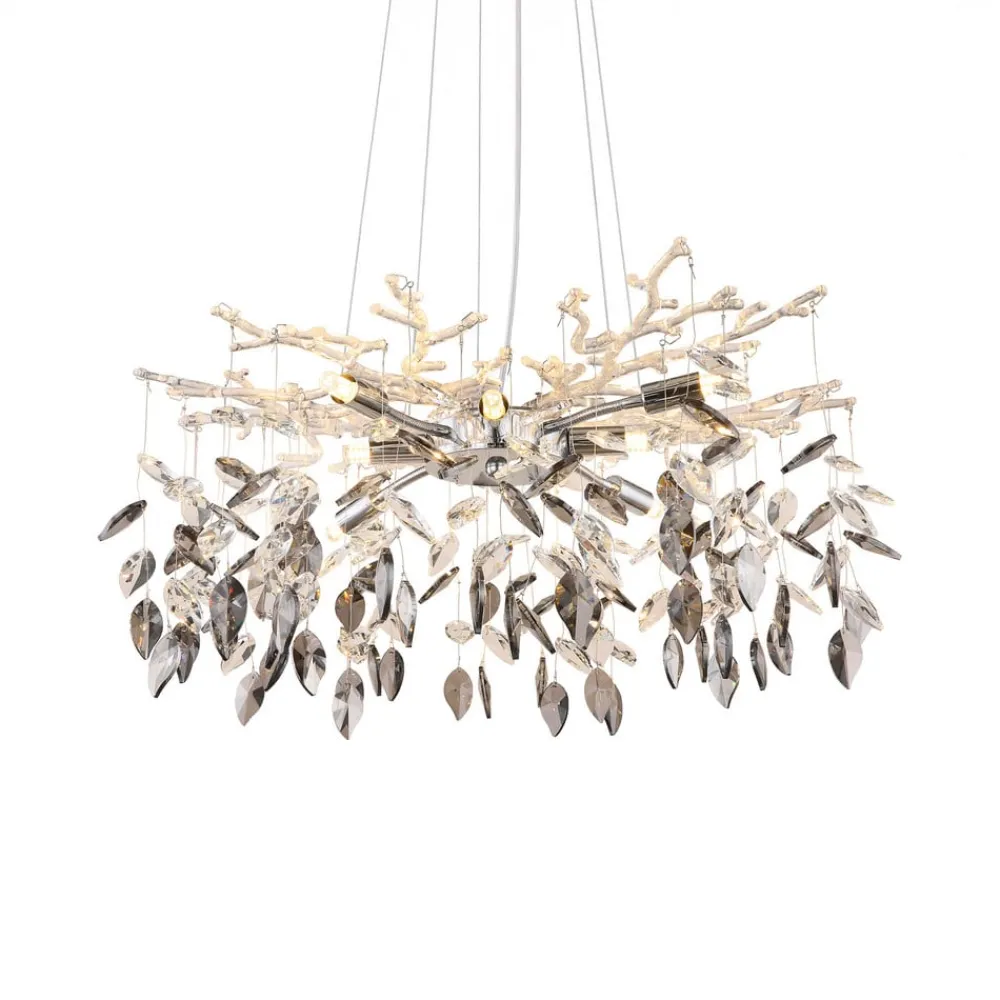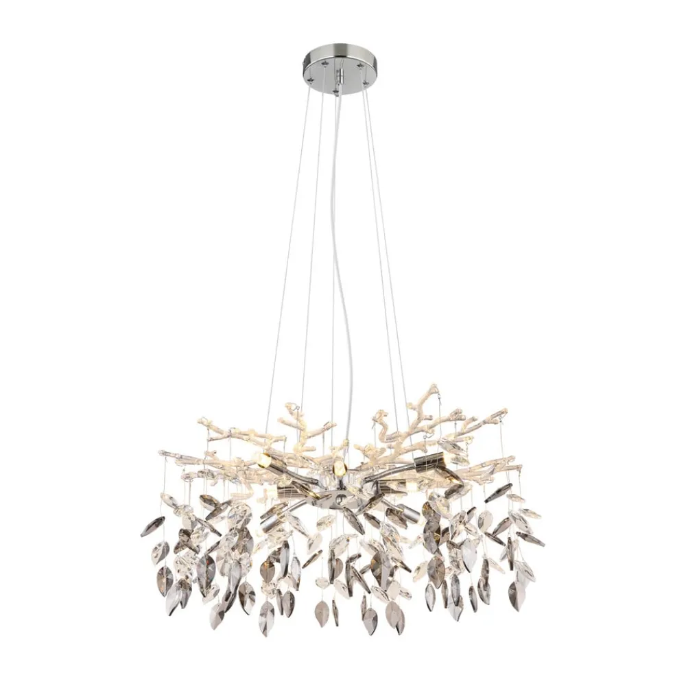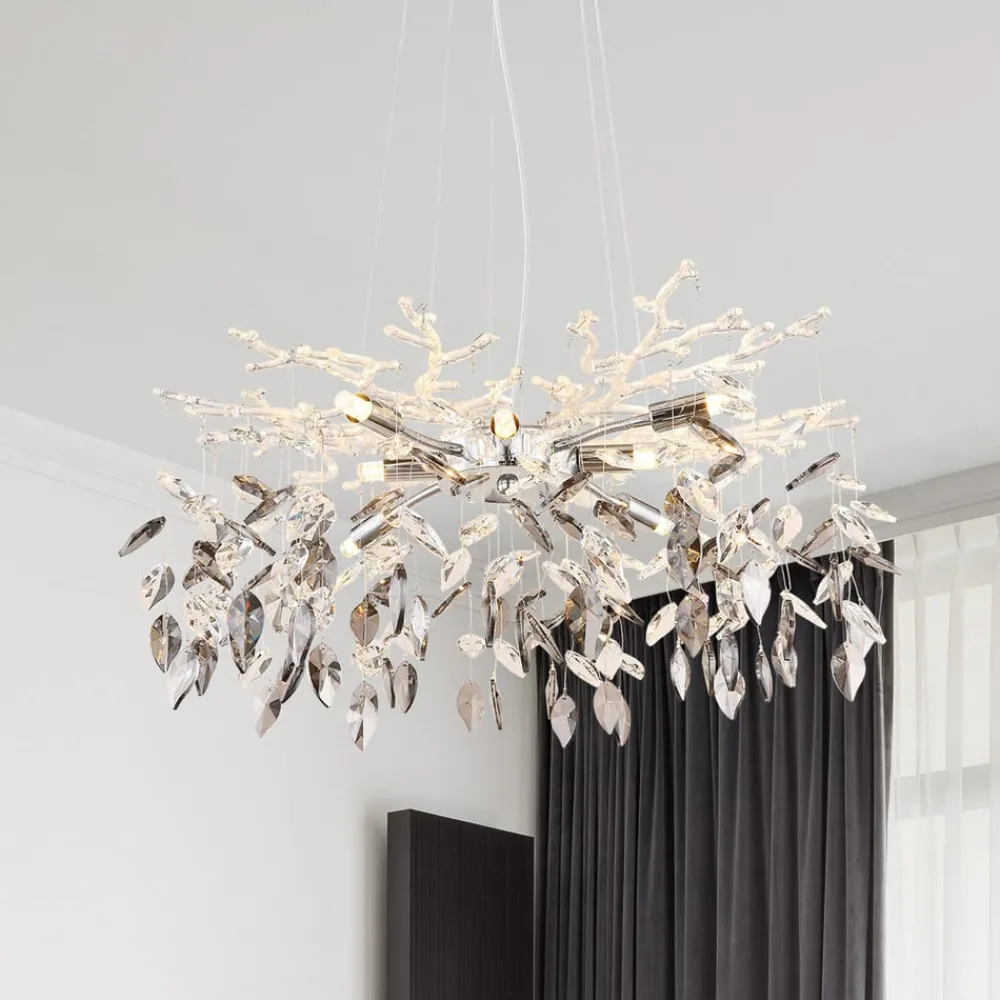 Lysekrone Danna kombinerer elegant design med materialer av høy kvalitet. Den er laget av metall og krystallglass og imponerer med sin elegante kombinasjon av krom, røykgrå og klare elementer. Den harmoniske fargen gjør den til et blikkfang i enhver stue eller spisestue. De kunstnerisk utformede krystallene reflekterer lyset på en fascinerende måte og skaper en unik atmosfære.