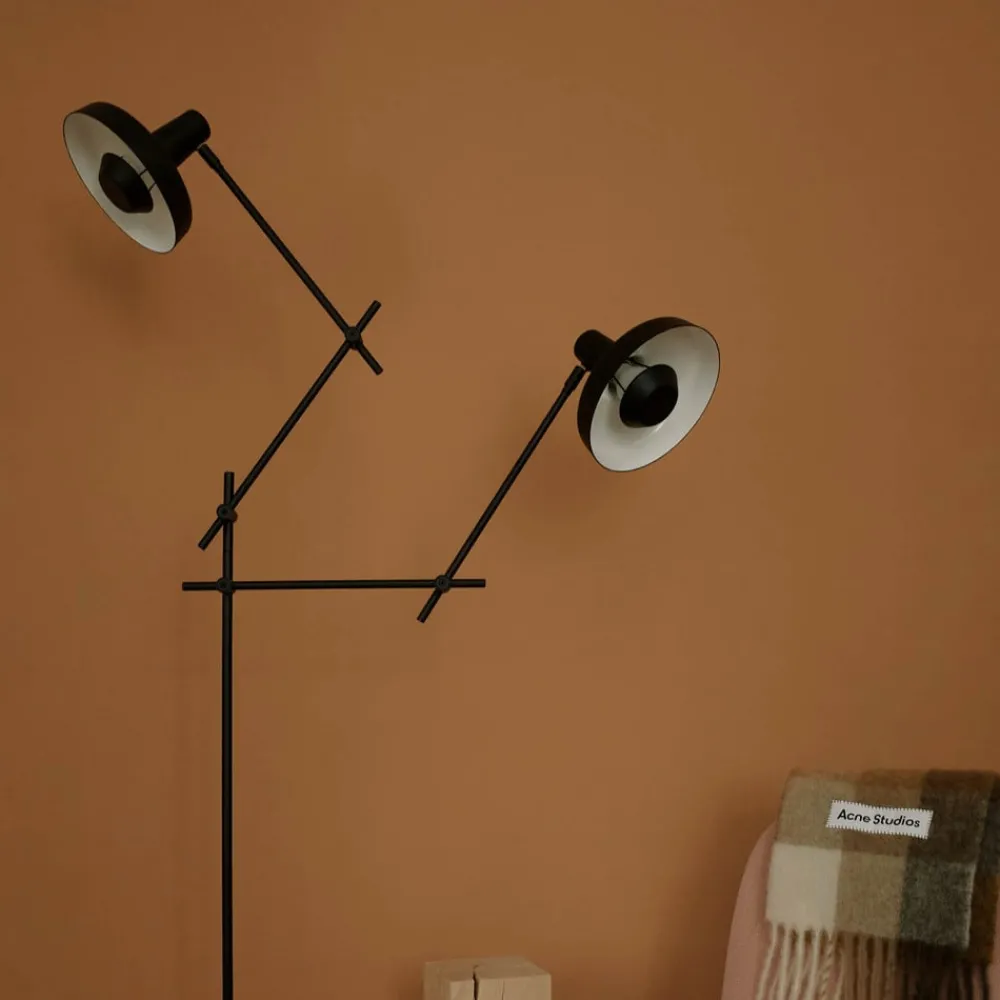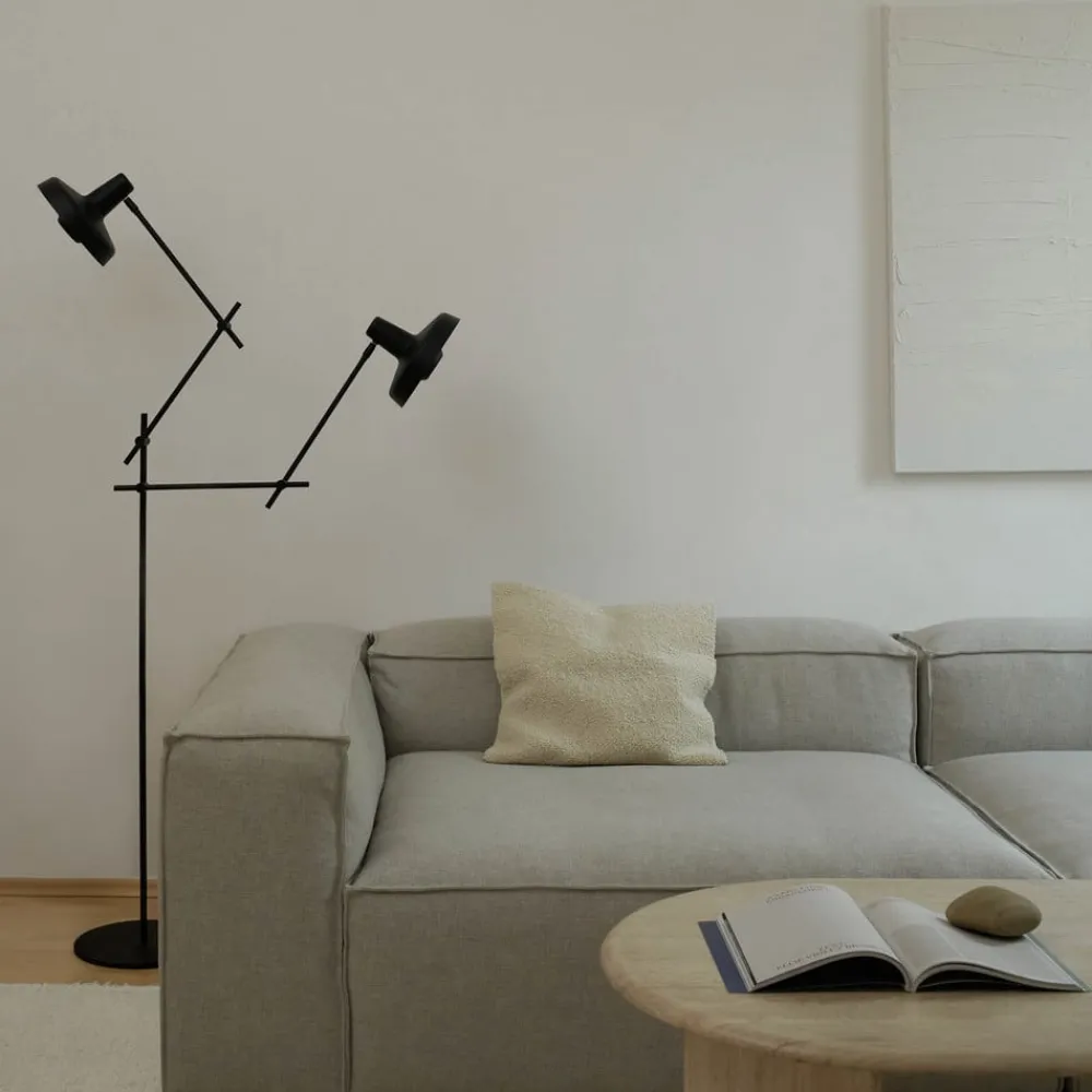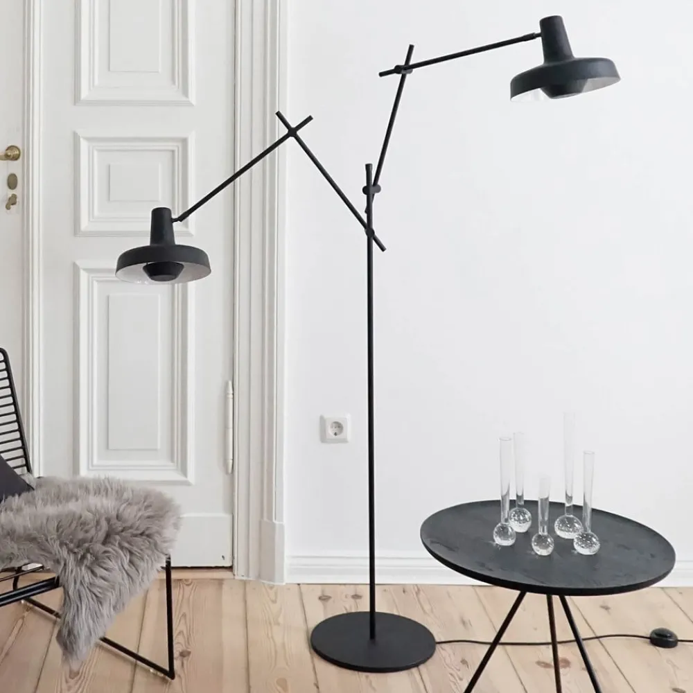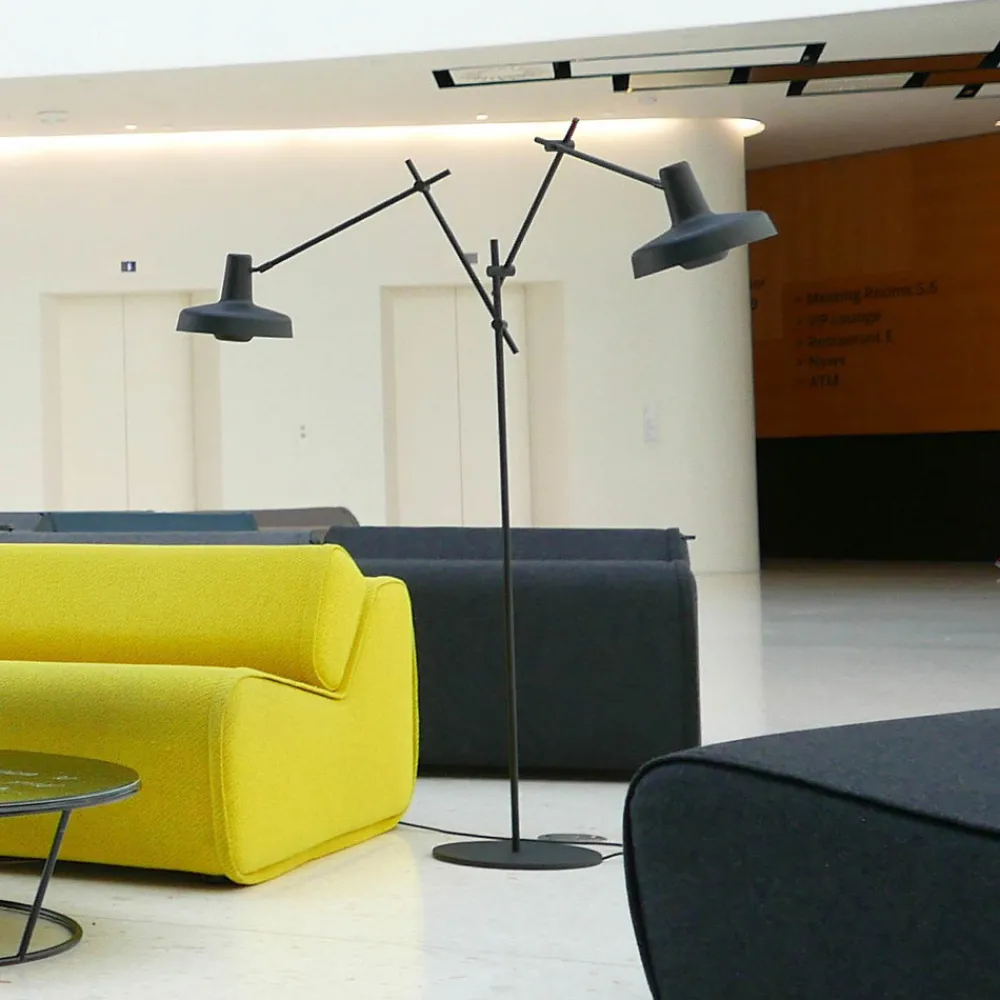 Kan kombineres med mange møbleringskonsepter og fleksibelt i lysutslippet, gulvlampen Arigato fra den kroatiske produsenten GRUPA er en ekstremt allsidig lyskilde. En høy stålramme er festet til en rund base, som bærer to sideveis utstikkende armer i det øvre området, som igjen er delt i to seksjoner og hver holder en rund aluminiumsskjerm. Armseksjonene og skjermene er hver festet med ledd for å sikre at lyset kan rettes etter situasjonen. Skjermkonstruksjonen med hvitt interiør er også gjennomtenkt til fordel for lavtap lysutslipp og blenderåpning for optimal visuell komfort.