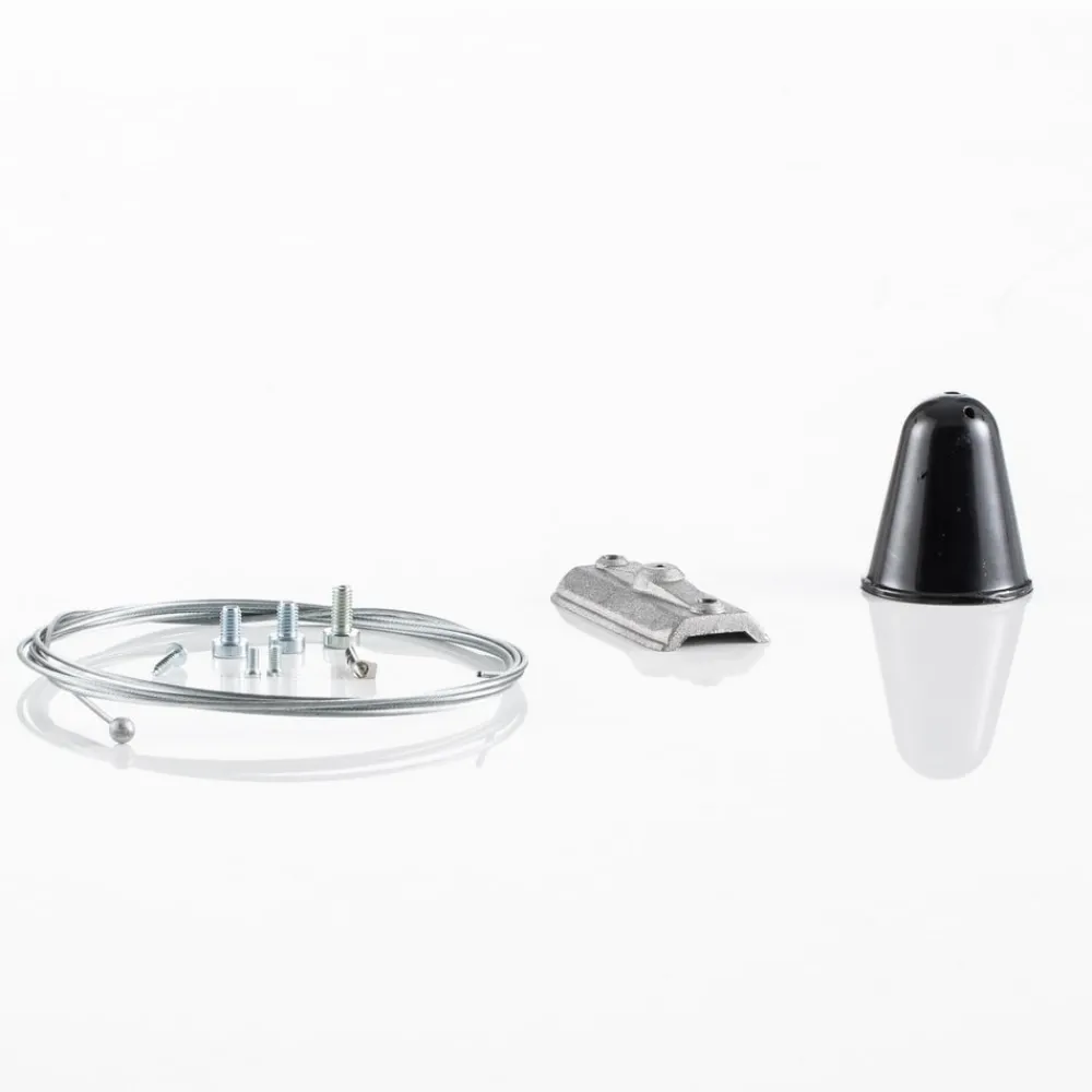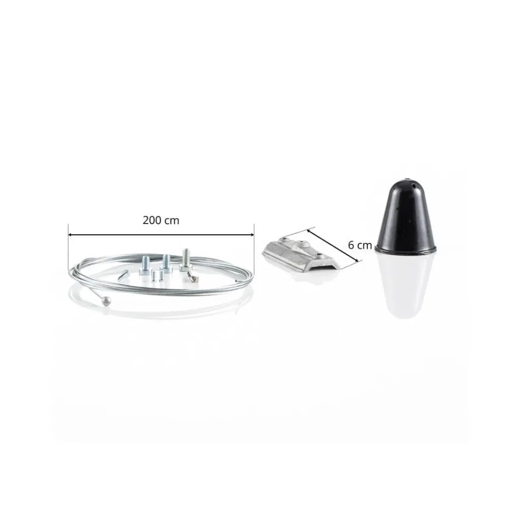 Dette opphengssettet med 200 cm ståltau, baldakin og 6 cm lang koblingsplate muliggjør opphengt montering av Ivela LKM 3-fase skinner.