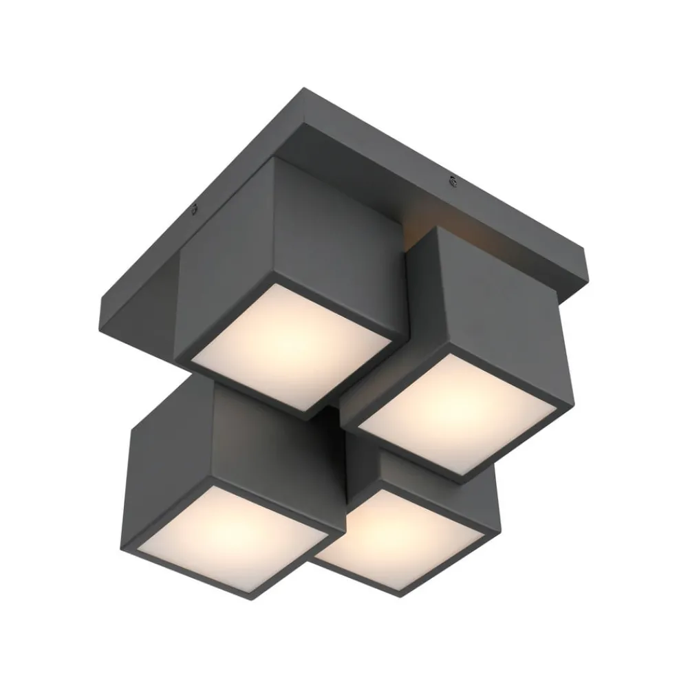 Taklampen Tetris med kantet utseende Den kantete ED-taklampen Tetris er laget av metall og er utstyrt med fire kubeformede lyselementer som sitter i ulike høyder under den kantete baldakinen. Hver kube er lukket i bunnen med et satengbelagt deksel, slik at det sendes ut et homogent lys i rommet. Noe av lyset spotlighter også opp mot taket, noe som skaper vakre lyseffekter – Ikke dimbar – Monteringsmateriale medfølger