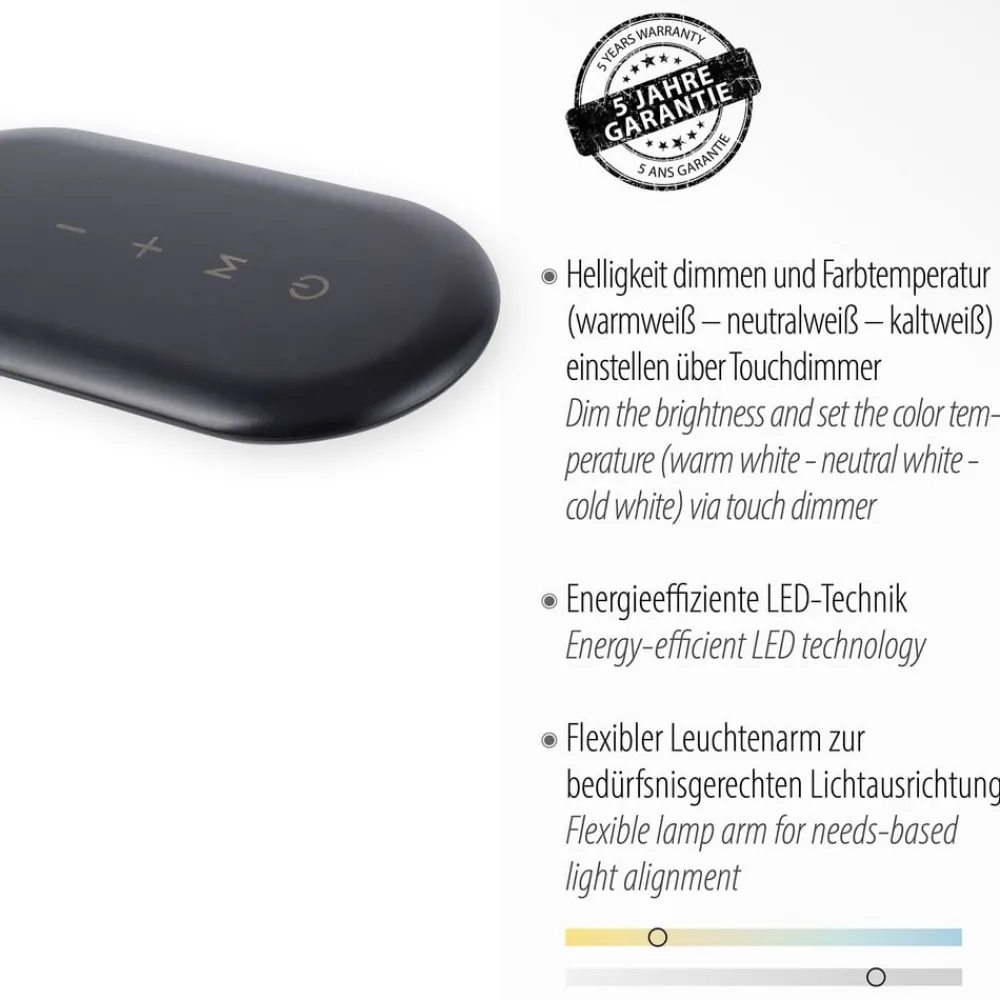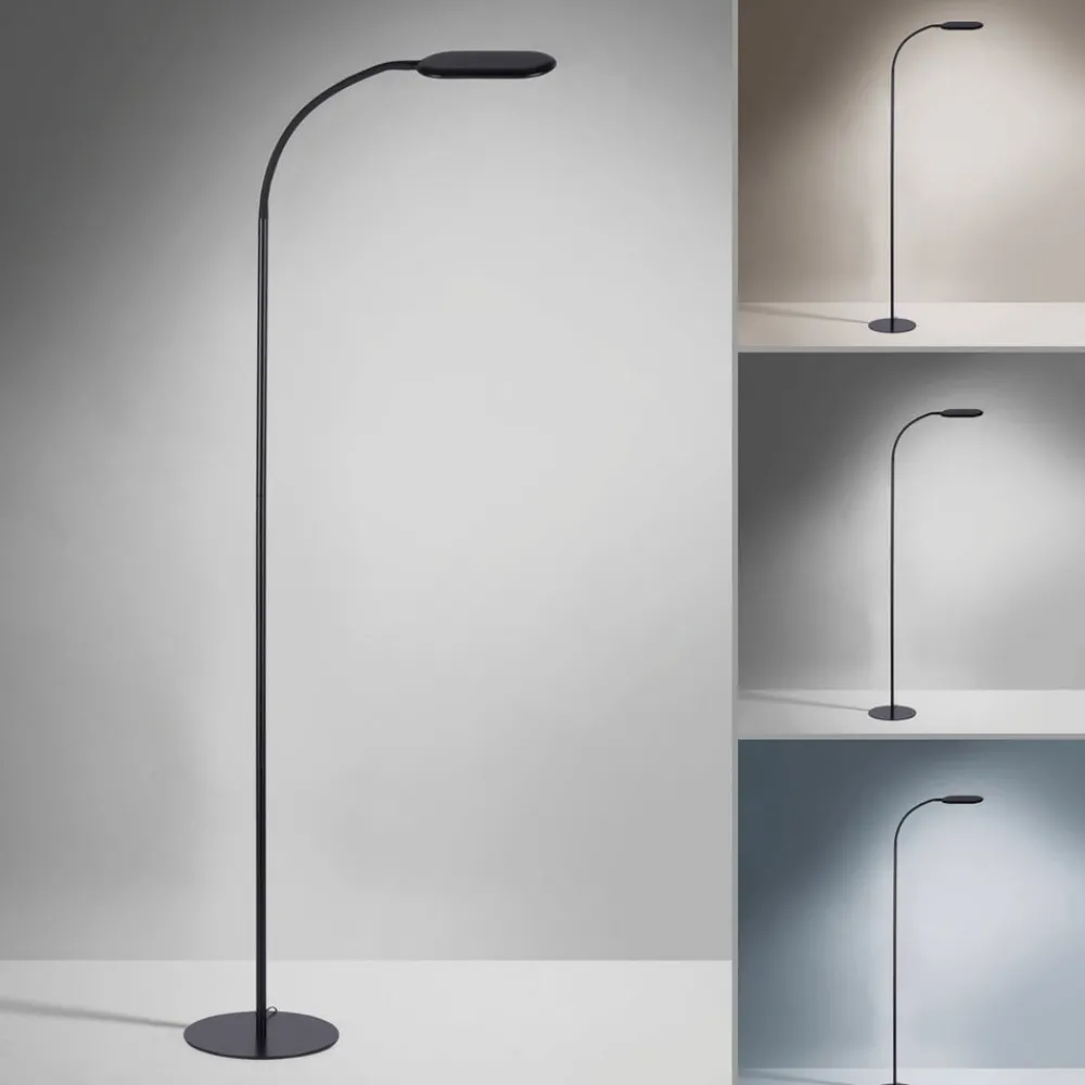 Den moderne LED-gulvlampe LED-er som enkelt kan betjenes via en berøringsdimmer. Enten du varierer lysstyrken eller justerer fargetemperatur, kan lyset justeres etter behov. Lysdiodene lyser rett nedover. Takket være høyden på gulvlampe og dens fleksible lampearm er den perfekt til bruk for eksempel ved skrivebordet eller som leselampe i stuen.