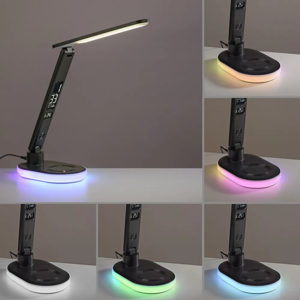 Tina LED-skrivebordslampe med mange funksjoner Den multijusterbare Tina LED-skrivebordslampen er perfekt for skrivebordet og tilbyr variabel belysning takket være sine mange funksjoner. Den viser dato, klokkeslett og temperatur, er utstyrt med en CCT-funksjon for valg av lysfarge på LED-lampene i lampehodet fra varmhvit til universalhvit belysning, en berøringsdimmer og fargevekslende RGB for LED-lampene som er montert rundt hele sokkelen. Lampehodet kan svinges 180° og roteres 90° i begge retninger. Begge lyskildene (hodet og sokkelen) kan kobles separat. Lampen er også utstyrt med en USB-port på baksiden, som for eksempel kan brukes til å lade en mobiltelefon.