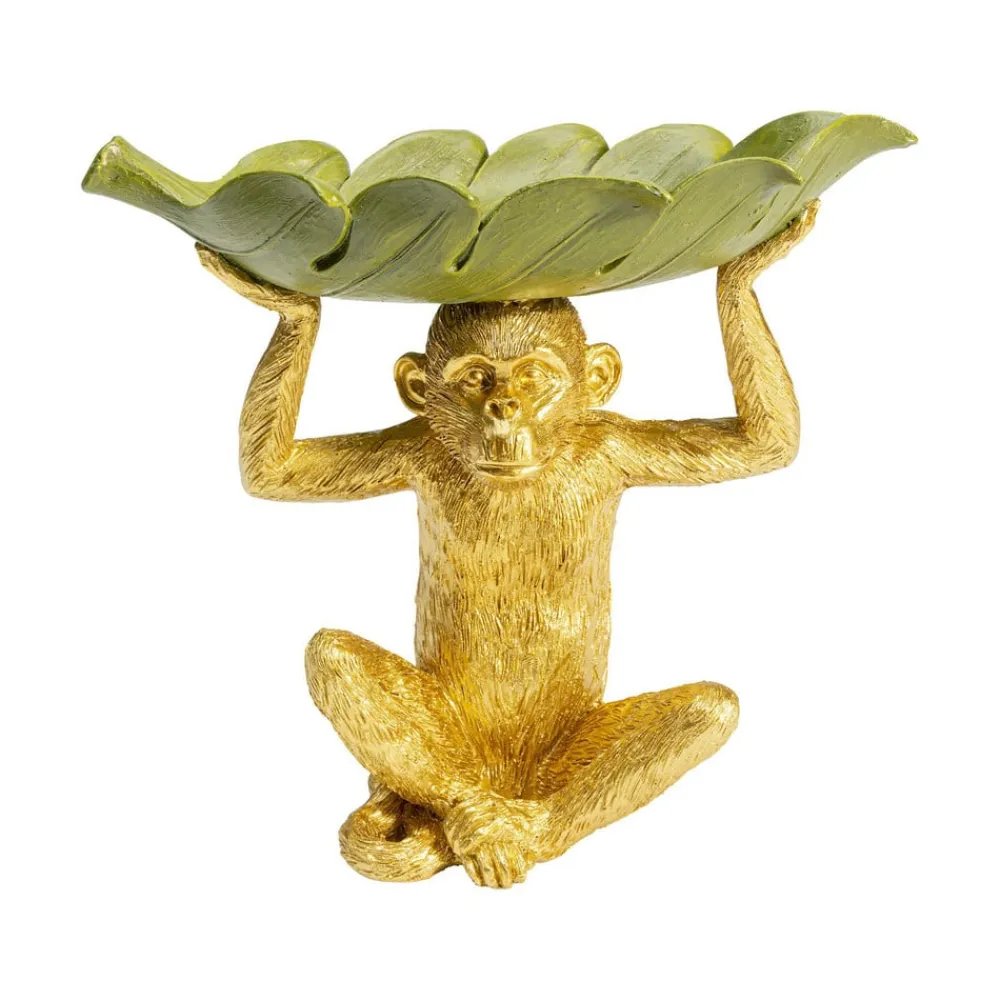 Dekorativ skål Banana Leaf laget av polyesin, lakkert og håndmalt Denne spotlight vakre hjelperen har alt under kontroll: Den dekorative skålen Banana Leaf kan brukes til å oppbevare nøkler, ringer eller snacks til en filmkveld, og den vennlige apen holder alt ryddig. Skulpturen er detaljert og kjærlig håndmalt. Med den gullfargede, malte apen og den grønne skålen gir pyntegjenstanden en jungelfølelse til stuen, soverommet, gangen eller hjemmekontoret.