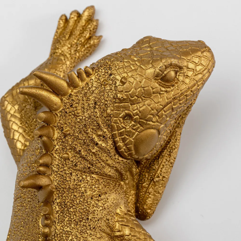 Veggobjekt i gullfarget, lakkert polyresin Denne gullfargede veggdekorasjonen i form av en øgle gir stilfulle og kreative aksenter til ethvert rom. En uvanlig gaveidé til reptilelskere og alle som setter pris på spesielle dekorasjoner. Øglen kan henges vertikalt på veggen.