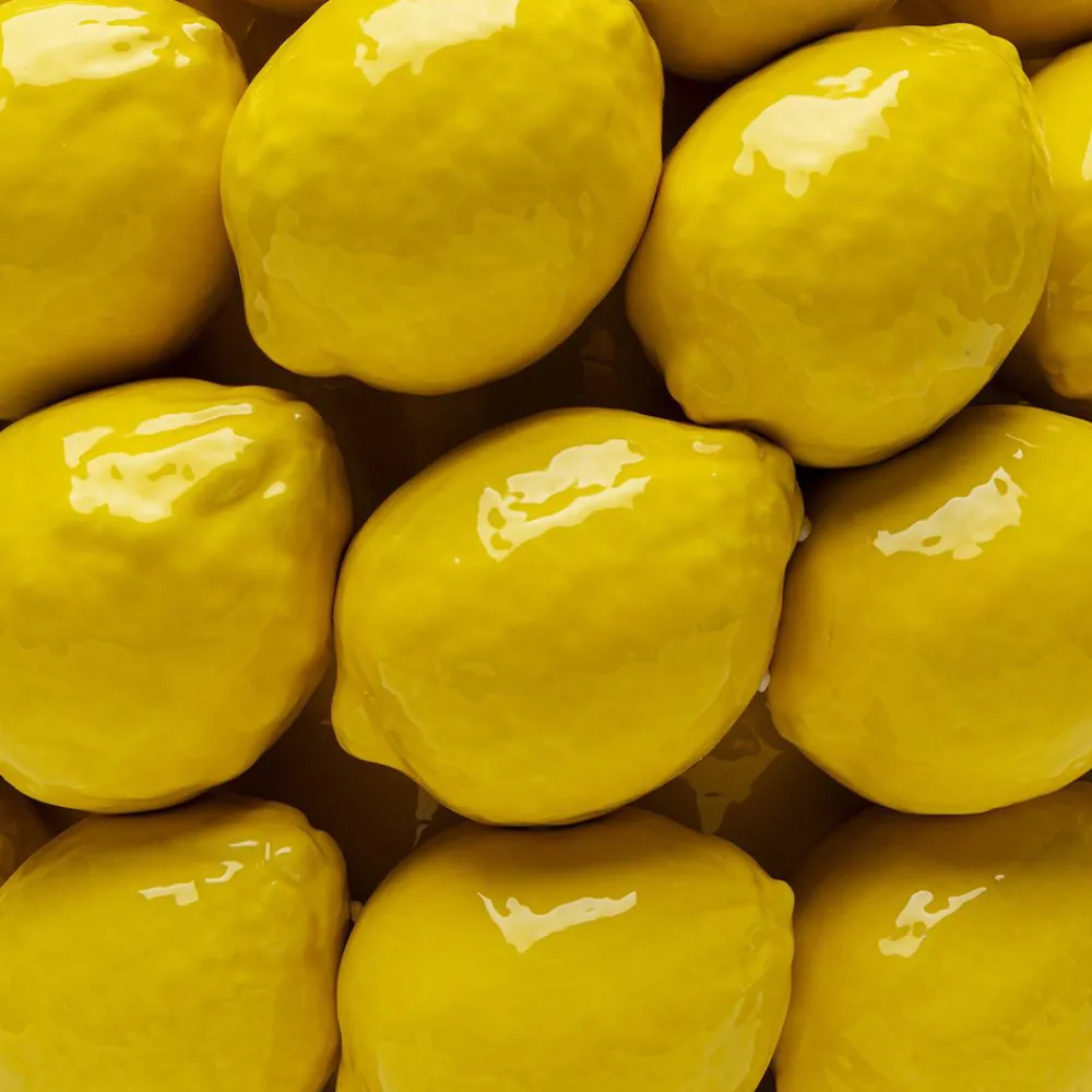 Sitronsaftvase i pæreform med sitroner Sitronvaser med imitert frukt er populære fordi de gir en fargeklatt til ethvert rom. Den knallgule fargen på sitronene virker forfriskende og oppkvikkende. De gir også et naturlig og organisk preg til interiøret og kan brukes som et dekorativt element i både moderne og tradisjonelle innredningsstiler. Lemon Juice-vasen er håndlaget i glasert porselen – hvert eksemplar er unikt.