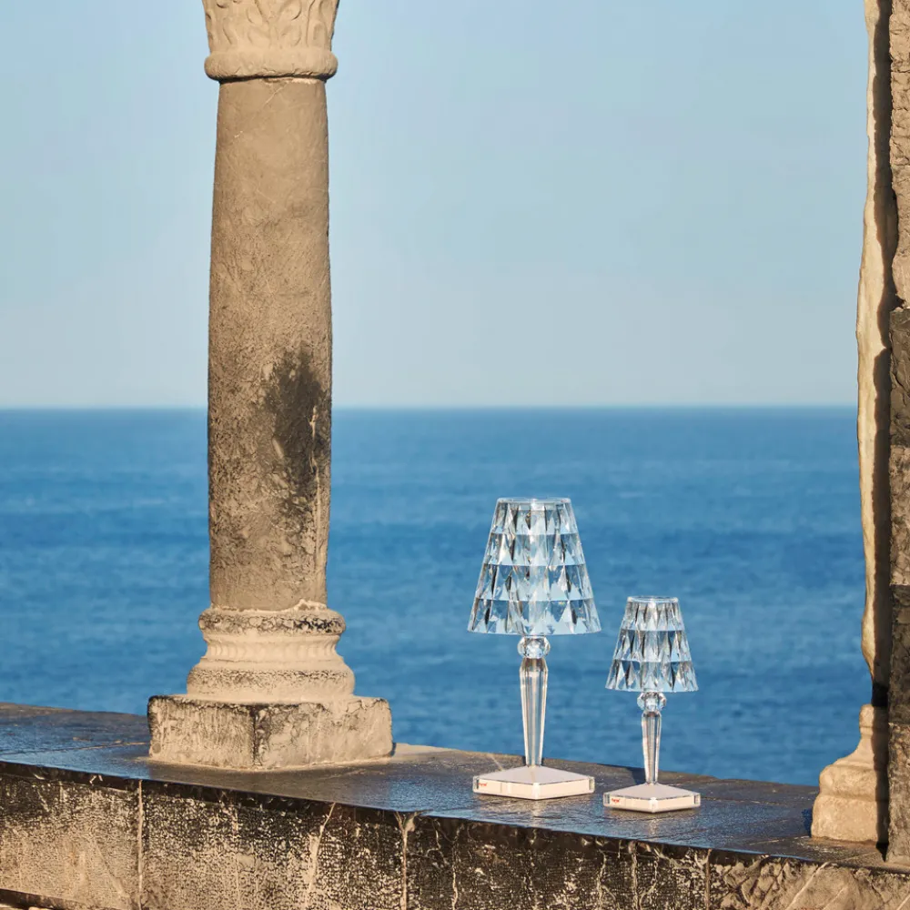 Med oppladbart batteri: Dekorativ batteridrevet bordlampe for utendørs bruk laget av resirkulert plast Den lille Battery LED-bordlampen er et dekorativt og praktisk tilbehør for utendørs bruk. For dette formålet er den utstyrt med kapslingsgrad IP54 og er derfor beskyttet mot ulike værpåvirkninger. Takket være det oppladbare batteriet kan bordlampen plasseres hvor som helst, f.eks. på terrassen, balkongen eller til og med i kontraktssektoren, der bordlampen er et stilig dekorativt element i uteområder på kafeer og restauranter. Det kraftigere oppladbare batteriet lades via en USB-tilkobling og har nå en maksimal lysvarighet på 14,5 timer. Den gjennomsiktige skjermen skaper fortryllende lysspill i omgivelsene takket være den fasetterte overflaten. I tråd med Kartells policy for bærekraft er den nye Battery-versjonen laget av resirkulert PMMA, et bærekraftig materiale av den nyeste generasjonen, som Kartells kontinuerlige forskning har gjort det mulig å bruke. Med den nye Battery går stil og ytelse endelig hånd i hånd. Det Milano-baserte selskapet Kartell er kjent for sine innovasjoner innen plast. I mer enn 60 år har anerkjente designere utviklet hverdagsgjenstander, møbler og også lamper i plast for Kartell. I løpet av tiårene har Kartell ikke bare mottatt en rekke priser for dette, men har også bygget opp et eget museum for å bevare selskapets materielle og immaterielle arv.