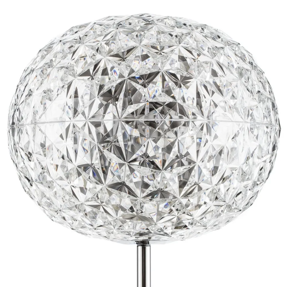 Den japanske produktdesigneren Tokujin Yoshioka designet denne spektakulære gulvlampe for den italienske merkevareprodusenten Kartell . lampeskjerm form minner noe om en planet som ikke er helt rund, men heller elliptisk. Det krystallinske utseendet på overflaten sørger for en magisk glitter og glitrende refleksjoner. Her er materialet materialet – i stedet for krystallglass brukes en spesiell syntetisk harpiks, såkalt termoplastisk teknopolymer, som på grunn av sin forskjellige materialtykkelse bryter lyset forskjellig i alle vinkler. Dermed er utfordringen med å skape en glitrende lyseffekt uten bruk av krystaller utmerket. Ved hjelp av den integrerte dimmeren kan planetens lysstyrke reguleres som ønsket.
