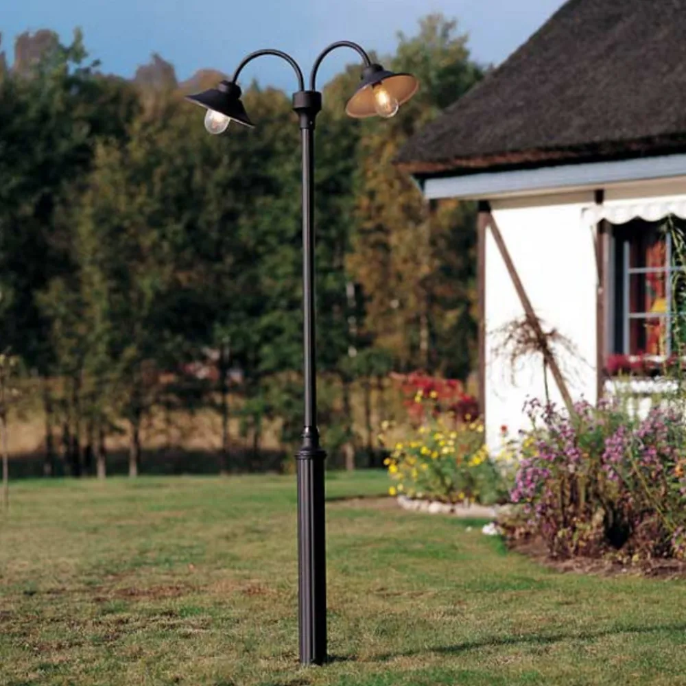 Den stilige lyktestolpen Vega er en aluminiumlampe med to glasskjermer. Begge har en buet lampearm, og hver av dem har en glasskjerm av høy kvalitet. Lampen er håndlaget i Europa og gir et bredt lys.