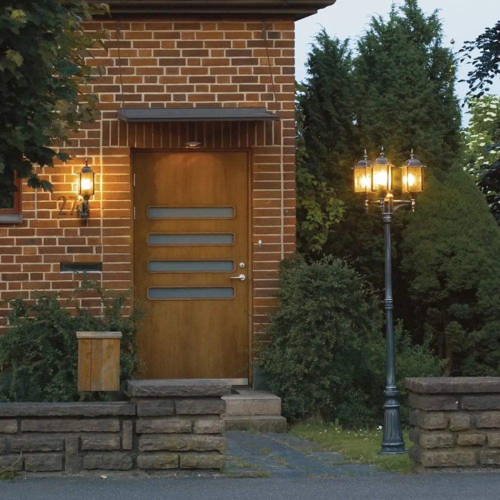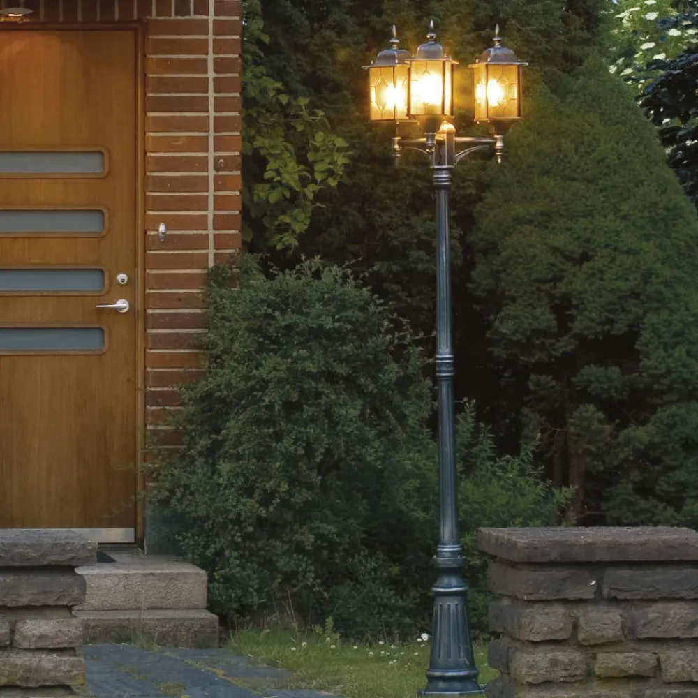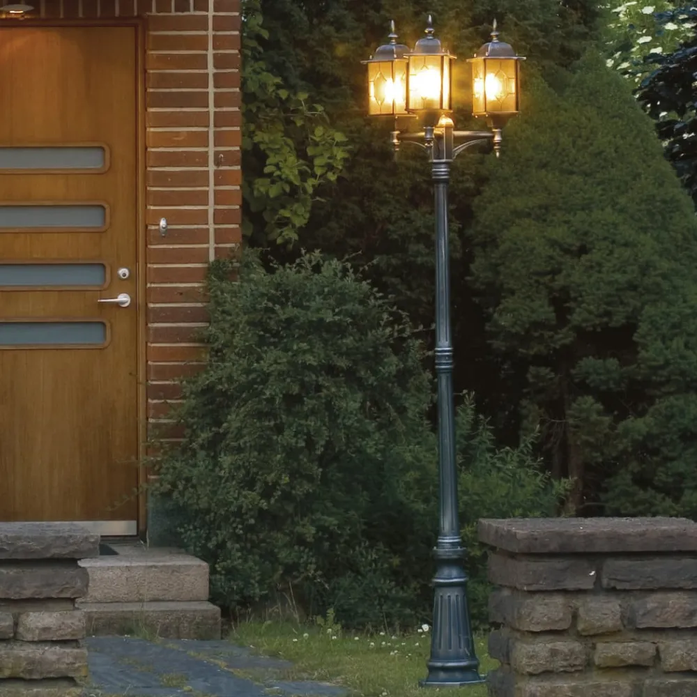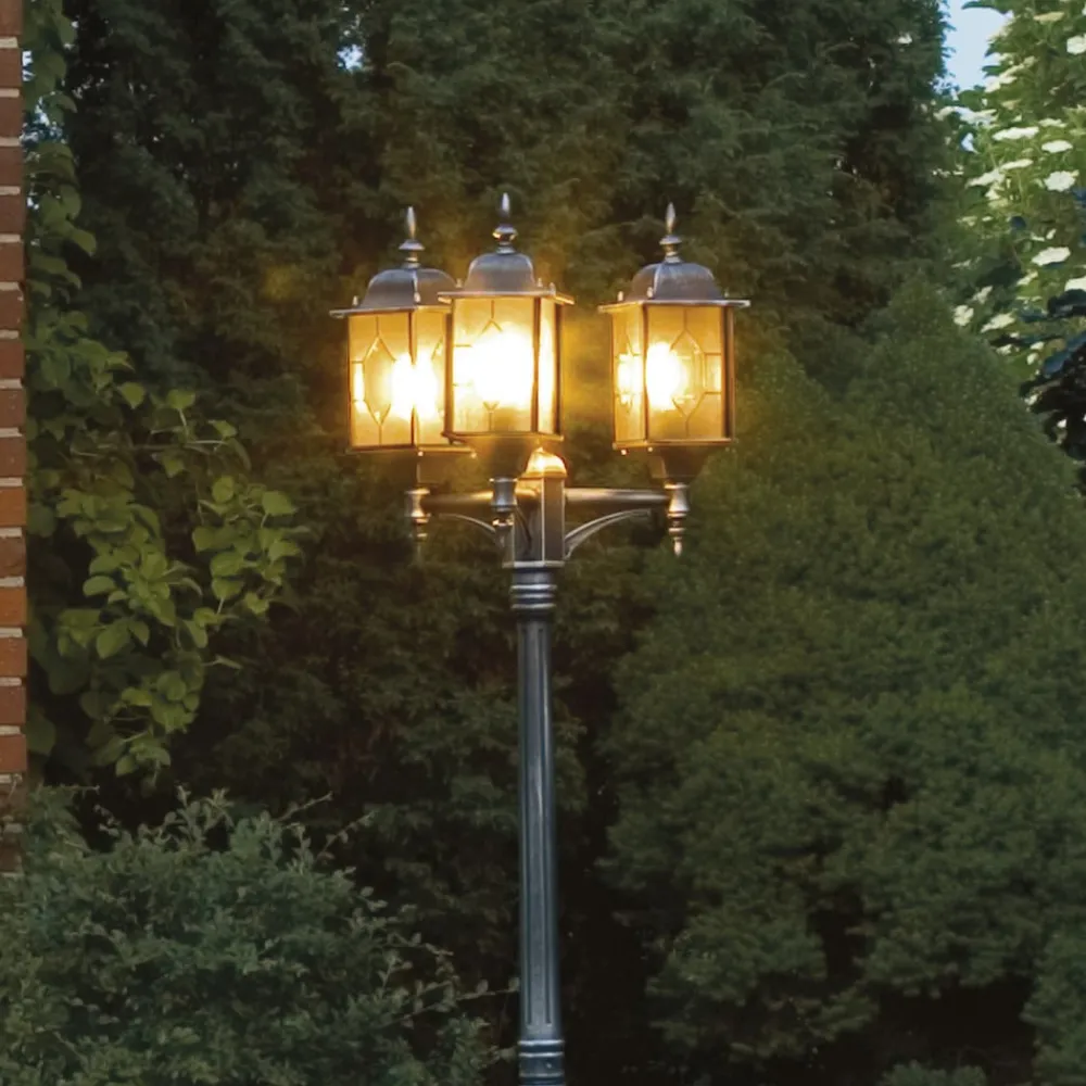 Denne lyktestolpen av aluminium har et svært edelt utseende med sine tre lanterner, akrylglassene i blykrystalloptikk og ornamentene på armene. Lanternene er ordnet i en trekant og sikrer dermed en god belysning.