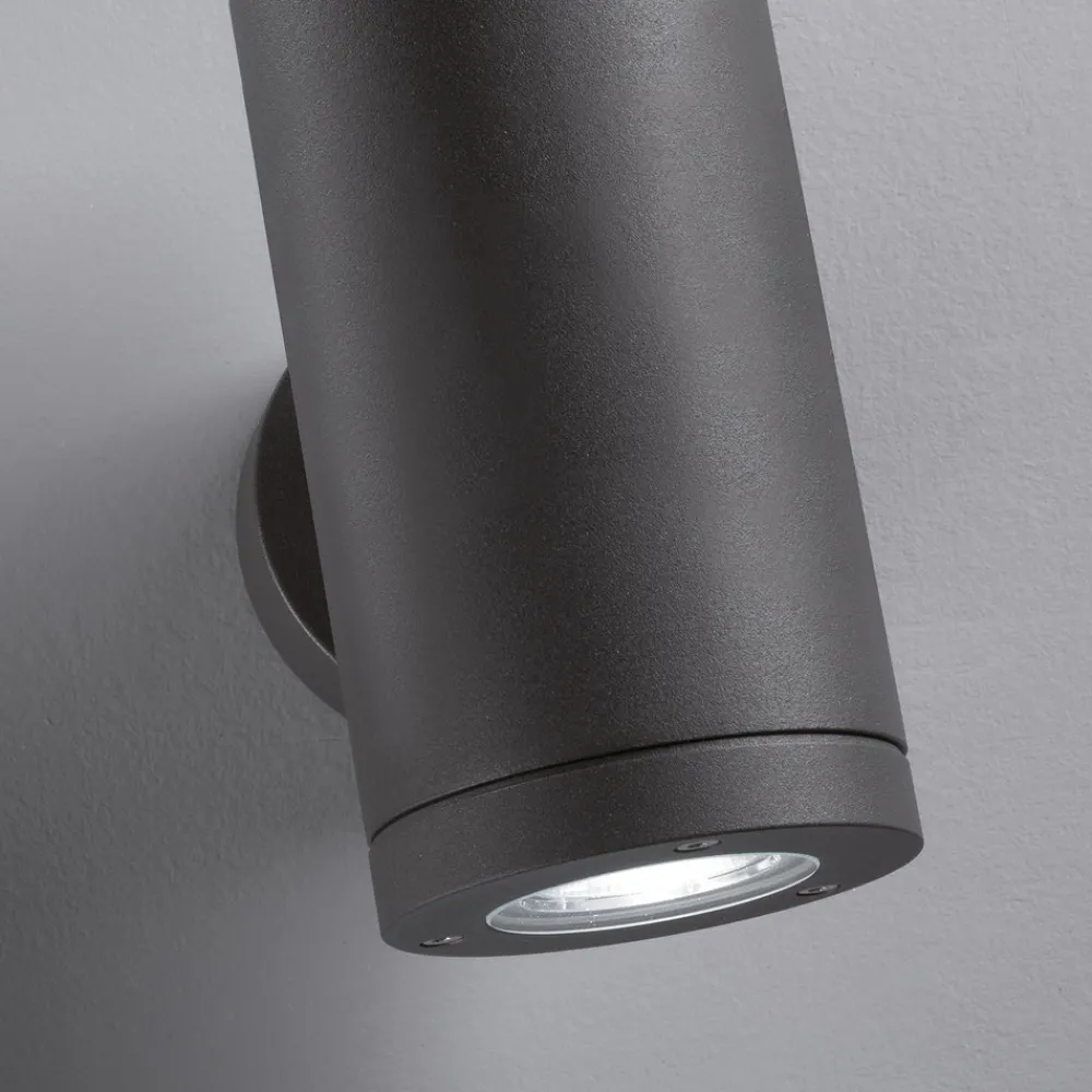 Utendørs vegglampen 1060 imponerer med sin robuste utførelse. Den består utelukkende av støpt aluminium, lyskildene er skjermet med flottørglass. En GU10- fatning er innebygd i den rørformede skjerm øverst og nederst.