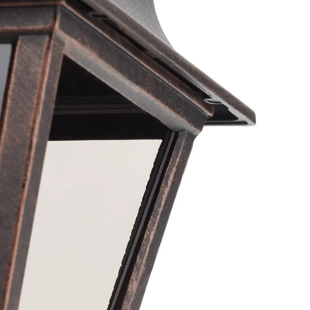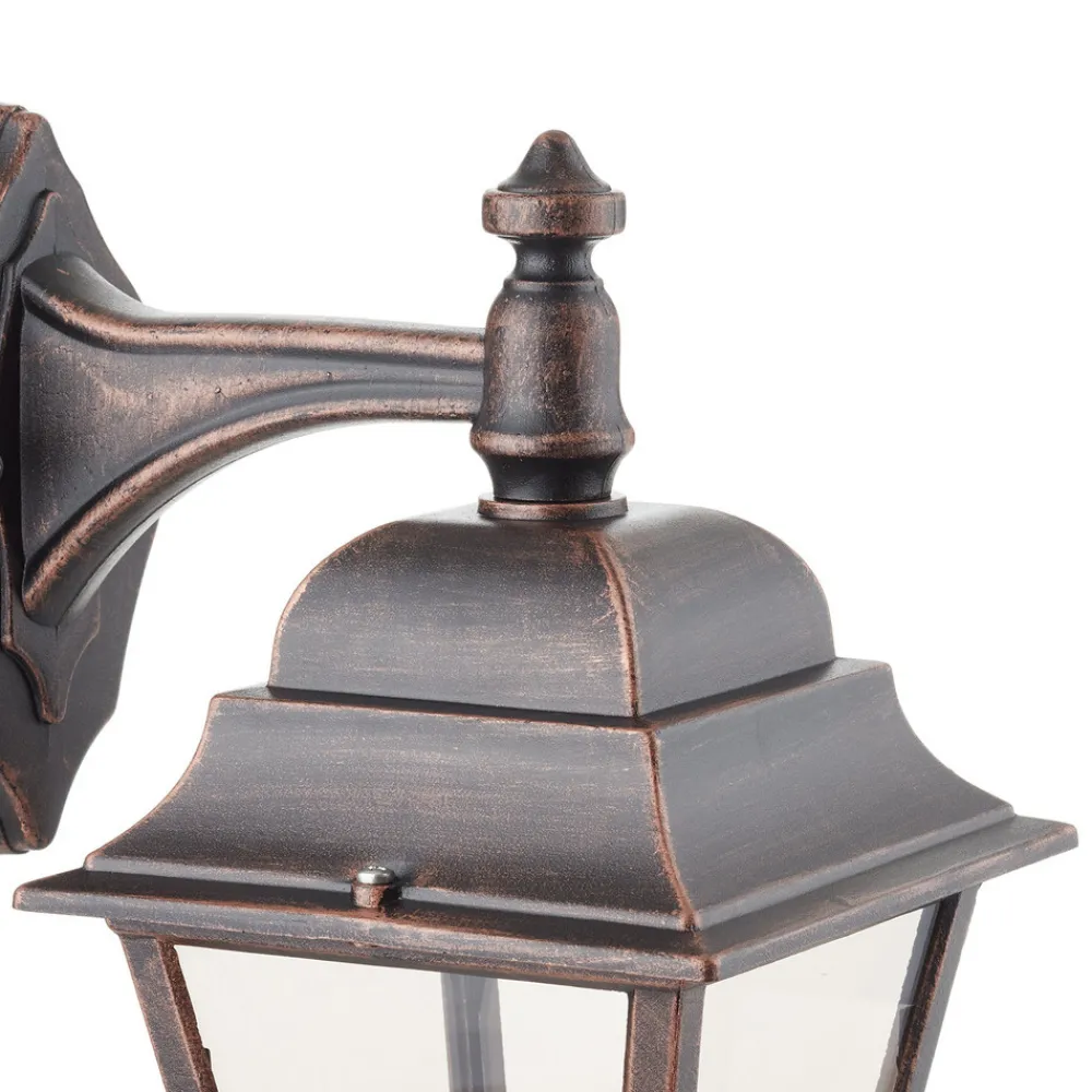 Klassisk utendørs vegglampe Toulouse Utendørs vegglampen Toulouse, som er formet som en antikk lykt av kobberfarget pulverlakkert aluminium og lett tonet glass og henger nedover, er spesielt vakker på gamle eller rustikt utformede bygninger. Det lett tonede, men klare glasset lyser opp omgivelsene på en klar og sikker måte.