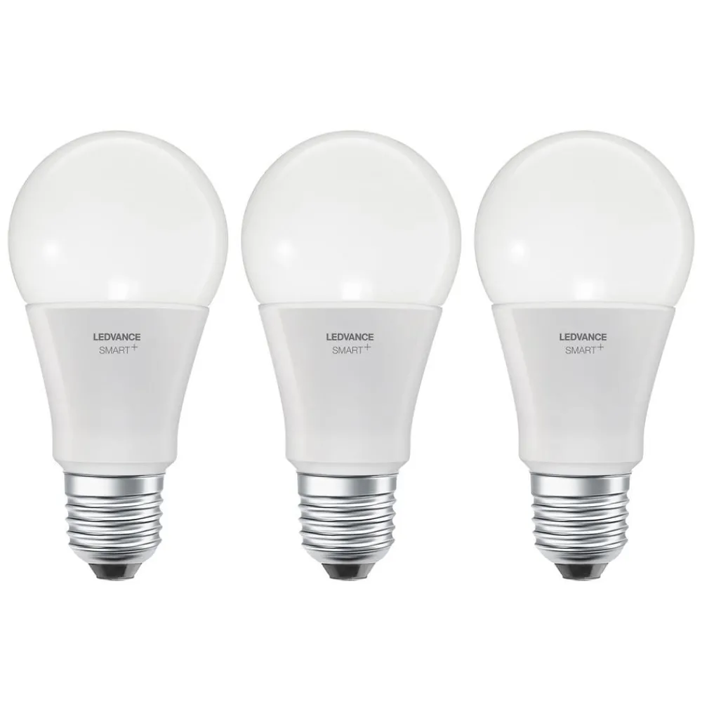 Tre LEDVANCE SMART+ E27 LED-lamper A60 med 9 W hver, avstembar hvit – app eller stemmestyring via WLAN i multipakning