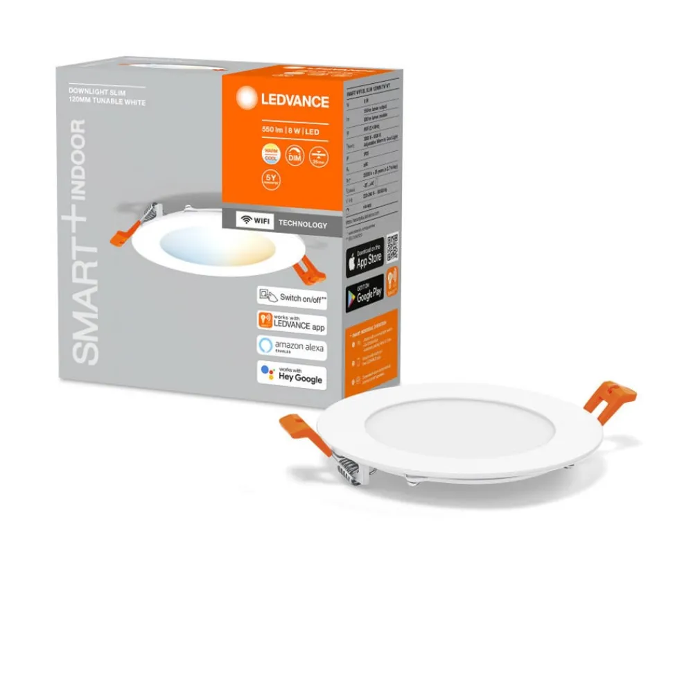 Orbis Downlight Slim innfelt LED-armatur med LEDVANCE SMART+ WiFi-teknologi Orbis Downlight Slim innfelt LED-armatur imponerer med sin slanke form og er ideell for tak med begrenset plass. Armaturen er laget av plast og kan for eksempel brukes til å belyse ganger, korridorer eller kjøkken, og driveren er integrert. Lysstyrken kan endres via app og talekommando, og det er også mulig å justere fargetemperaturen fra varmhvitt til dagslyshvitt. Integrering skjer med LEDVANCE SMART+ WiFi-teknologi via WLAN – kan styres gratis via LEDVANCE SMART+ WiFi-appen (med minst Android 4.4 eller iOS 9.0); muliggjør forhåndsinnstillinger og automatisering – stemmestyring via Google Assistant eller Amazon Alexa er mulig (krever respektive smarthussystem) – justerbar fargetemperatur: 3000 K – 6500 K – dimbar – nettverksprotokoll: WiFi 2,4 GHz