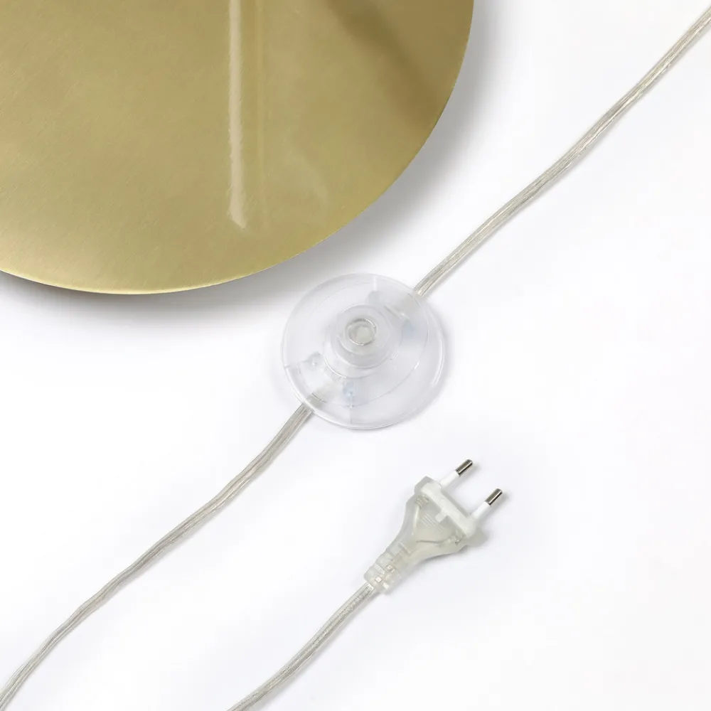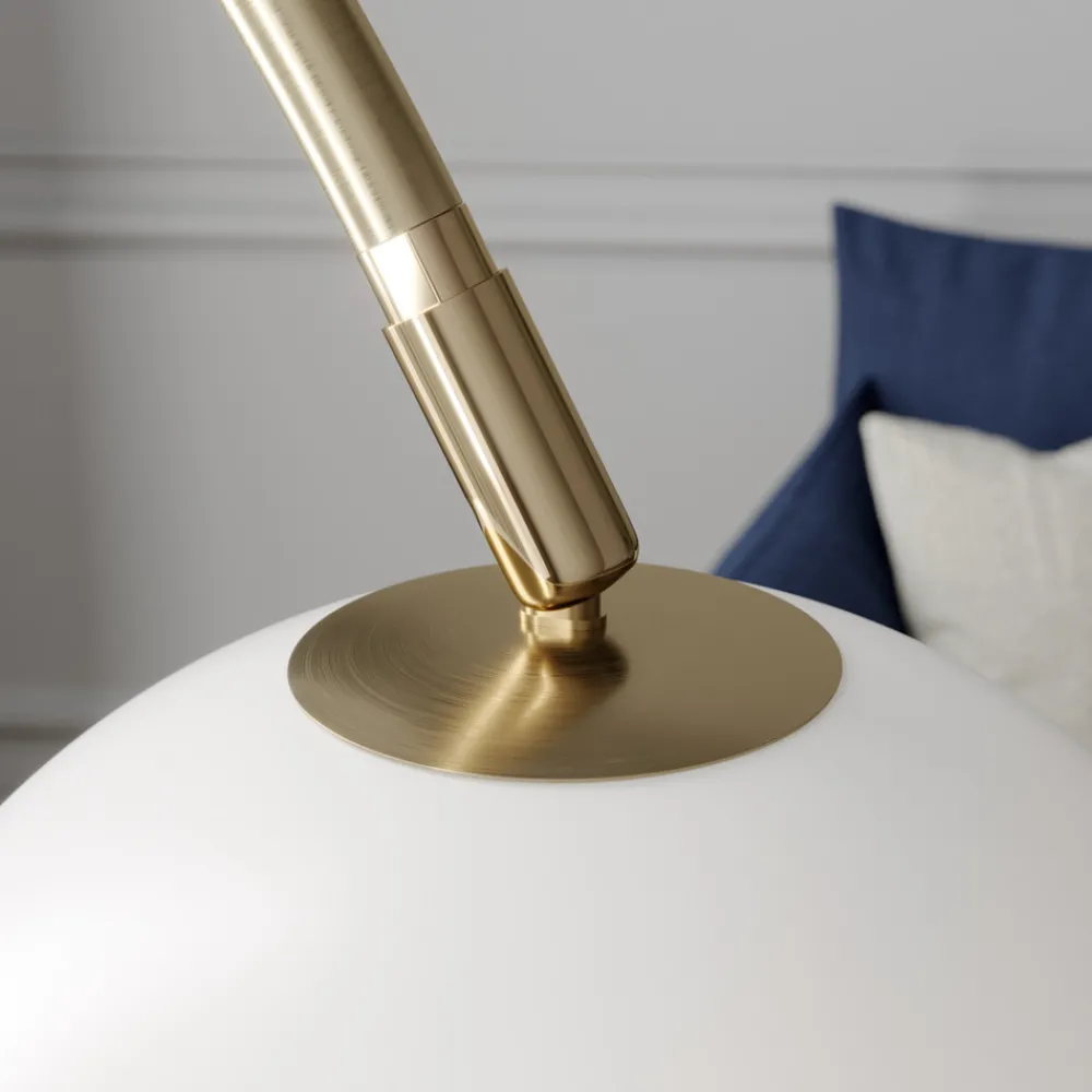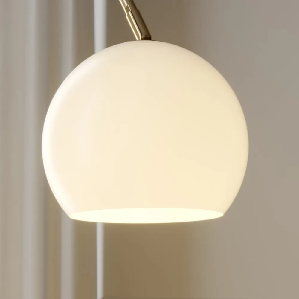 Buelampe Cynthia i messing med hvit glassskjerm Gulvlampen Cynthia har en tiltalende buet form, noe som gjør den ideell til bruk i stuen ved siden av sofaen og spesielt effektfull som aksentbelysning om kvelden. Metallstativet har en messingfarget finish som gir et litt mer klassisk uttrykk og derfor kan kombineres med andre tilsvarende stiler. Lampeskjermen er laget av hvitt glass og gir et mykt, koselig lys med en hjemmekoselig følelse. Du kan gjerne påvirke lyset og den koselige effekten med en passende pære. Det er en fotbryter i forsyningskabelen.