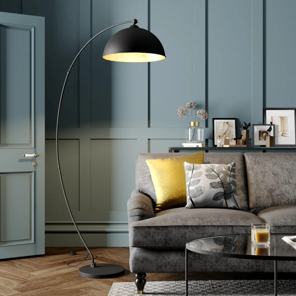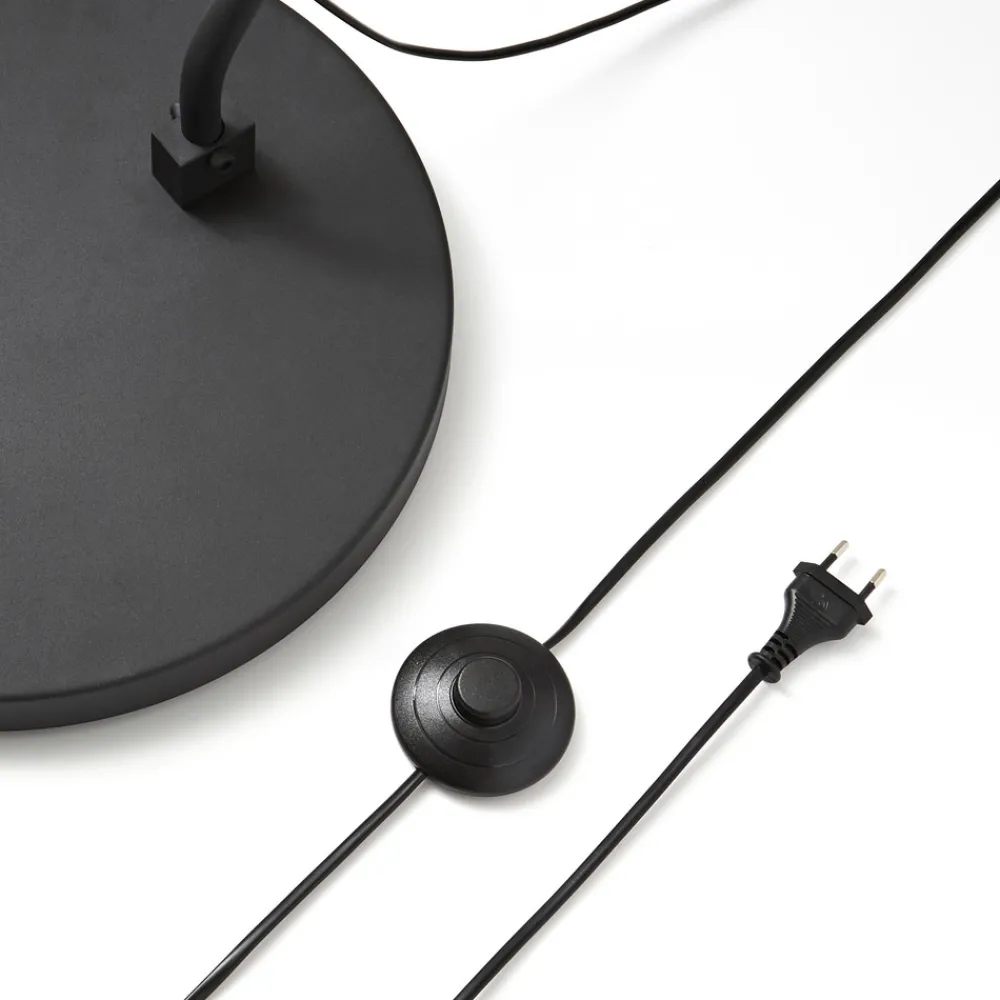 Attraktiv Jonera gulvlampe i buet form med skjerm i svart og gull Jonera passer til moderne boligstiler og viser en tydelig minimalisme, da designet på den buede gulvlampen bevisst unngår bruk av overdrevent detaljerte elementer. Gulvlampens base er rund, og fra den fører et smalt, buet element til lampeskjermen. Denne er formet som en halvkule og er malt i matt sort på utsiden, mens innsiden har et matt gullskimmer. Svart og gull er farger som harmonerer spesielt godt med hverandre, og derfor blir denne kombinasjonen stadig mer populær i belysningsbransjen. Lampeskjermer som er gullfarget på innsiden, har også den funksjonen at de gir et spesielt varmt og varmt lys, og de skaper spesielt koselige reflekser – et førsteklasses valg til stuen! Fotbryteren er plassert i gulvlampens tilførselskabel, slik at Jonera enkelt kan slås av og på.