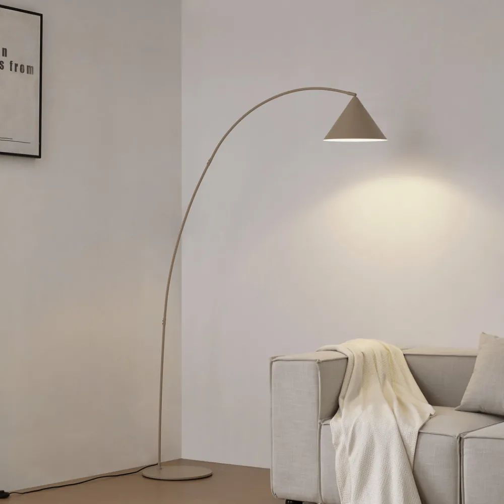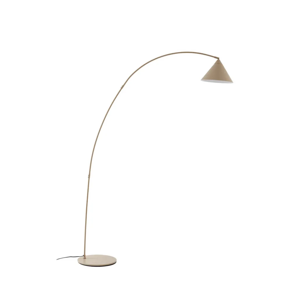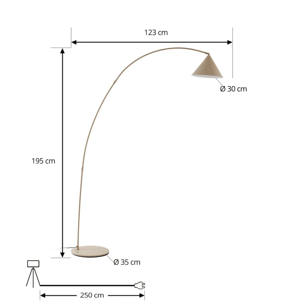 Lindby gulvlampe Triangolo i naturlig beige kombinerer moderne design med praktisk fleksibilitet. Den er laget av høykvalitets metall og passer perfekt inn i moderne hjem og tilbyr en stilig belysningsløsning. Den diskrete fargekontrasten mellom beige og hvit på innsiden av den koniske skjermen skaper et behagelig lys som stråler nedover.
