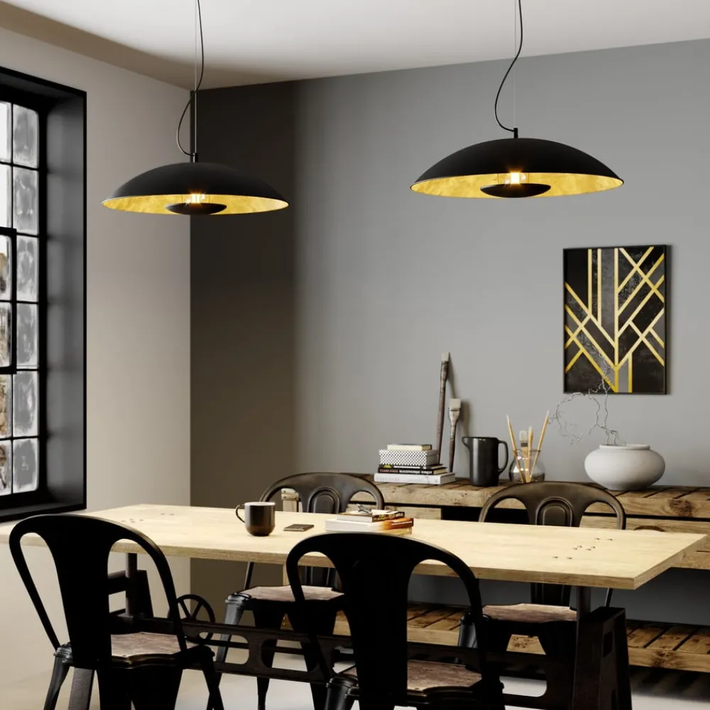 Pendellampen Emilienne i svart og gull med rund metallskjerm og indirekte lysutslipp for en spesielt koselig atmosfære Den runde formen på metallskjermen ser veldig elegant ut, noe som forsterkes ytterligere av at skjermen har en matt gullfinish på innsiden, slik at pendellampen avgir et dypt og varmt lys. Pendellampens koselige effekt forsterkes av at Emilienne har en skjerm rett over pæren, som bare tillater indirekte lysutslipp og derfor skaper et mykt, flytende lys uten blending. Hvis for eksempel et spisebord skal belyses på en virkelig koselig måte, er denne pendellampen absolutt et belysningselement som bør komme på shortlisten.