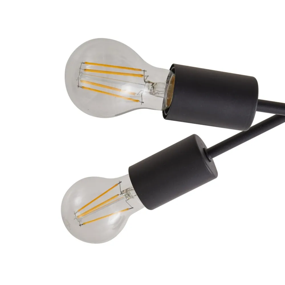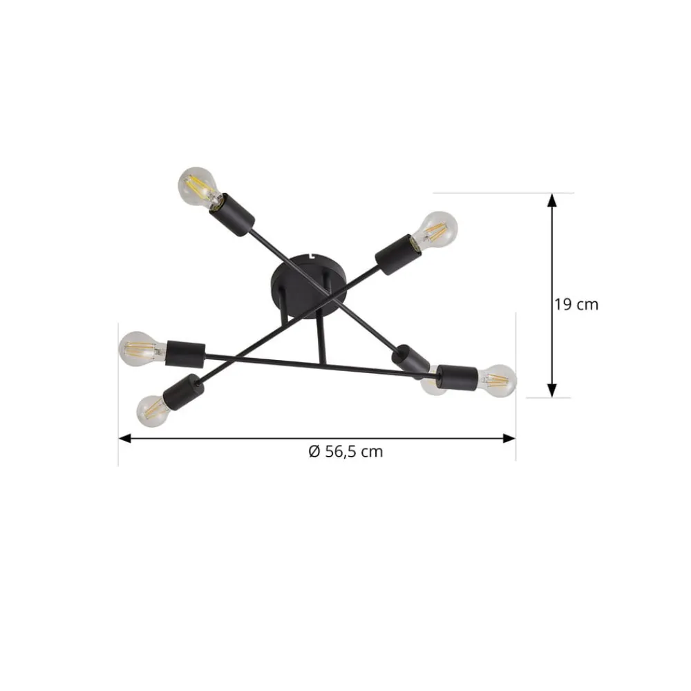 Estar taklampe med et trendy vintagepreg Estar taklampe består av tre metallstag som overlapper hverandre. Hver av de tre stagene er rettet inn i hver sin retning. Dette sikrer optimal lysfordeling. For å lyse opp rommet på en god måte er ikke pærene dekket av en lampeskjerm, slik at lyset kan spre seg uhindret. Dette betyr også at lyskilden er i fokus, og det bør derfor velges en lyskilde med et attraktivt glødetråd- eller karbonfiberutseende. Den åpne designen sikrer ikke bare god belysning, men gir også lampen et trendy vintagepreg.