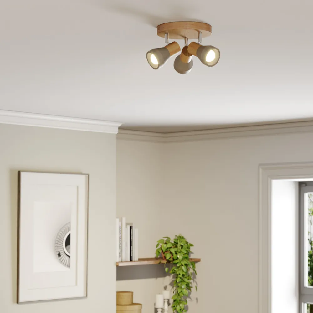 Filiz rund spotlight i tre/betong med svingbare skjermer og fatninger E14 Med sin spesielle design bestående av en treramme og skjermer i betong passer Filiz godt inn i interiørstiler med enten skandinavisk eller industriell karakter. Den vakre treoverflaten bringer mye naturlighet inn i oppholdsrommet, og hver enkelt spotlight kan justeres etter behov for å tilpasse lyset bedre. Filiz er ideell for grunnbelysningen i et rom, som kan suppleres etter behov med ekstra lyskilder med en stemningsfull eller praktisk karakter.