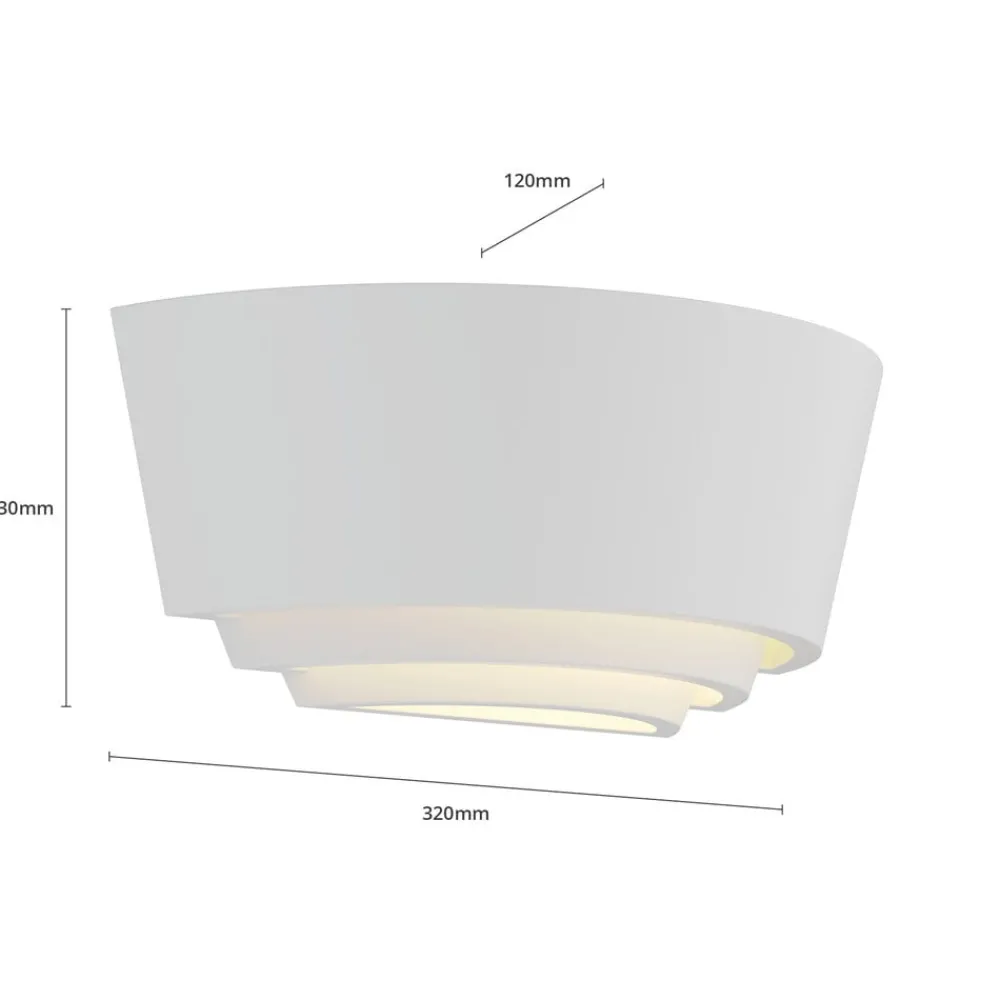Vegglampen Azriel er laget av gips, et material som kan males på etter et ønske. Dette gir deg muligheten til å til passe lampen enda bedre inn i omgivelsene. Du kan for eksempel la den være i samme farge som veggen. Lampeskjermens design har tre trinn, som ikke bare ser dekorativt ut, men har også en effektfull påvirkning på lyset.