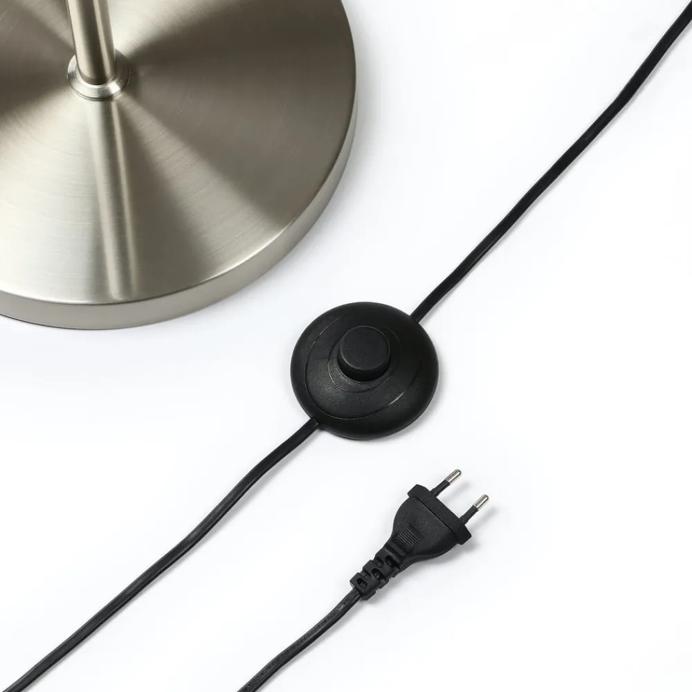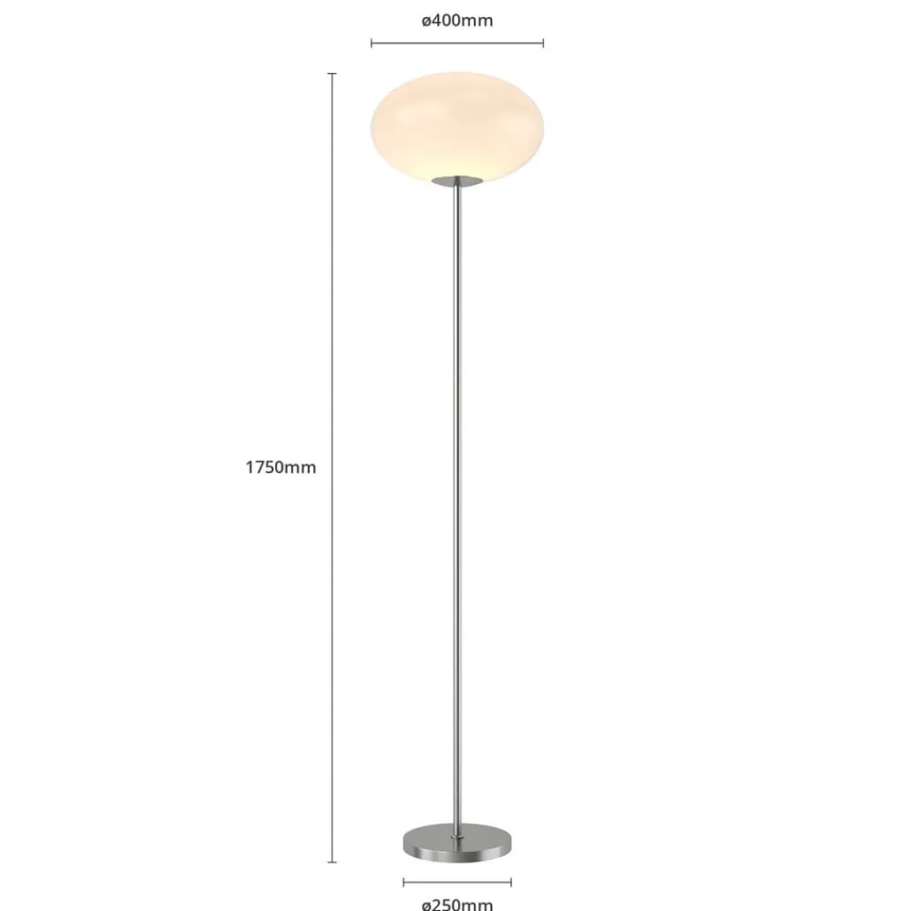 Elegant Sonika gulvlampe med rund lampeskjerm i glass Sonika gulvlampe imponerer med sitt designorienterte og puristiske utseende. Stativet har en nikkelfinish og er slankt. Nederst avsluttes armaturen med en rund sokkel. Takket være den utstående lampeskjermen i opalt glass skapes en vakker og harmonisk kontrast som umiddelbart fanger blikket. Det matte glasset har den fordelen at lyset kan sendes jevnt ut i alle retninger uten å blende betrakteren. Sonika er derfor ideell som stilfull aksentbelysning i stuen. Armaturen er utstyrt med en fotbryter, er enkel å betjene og kan brukes med en E27-pære.