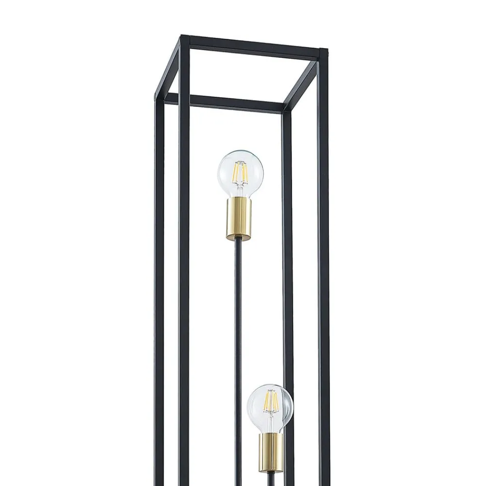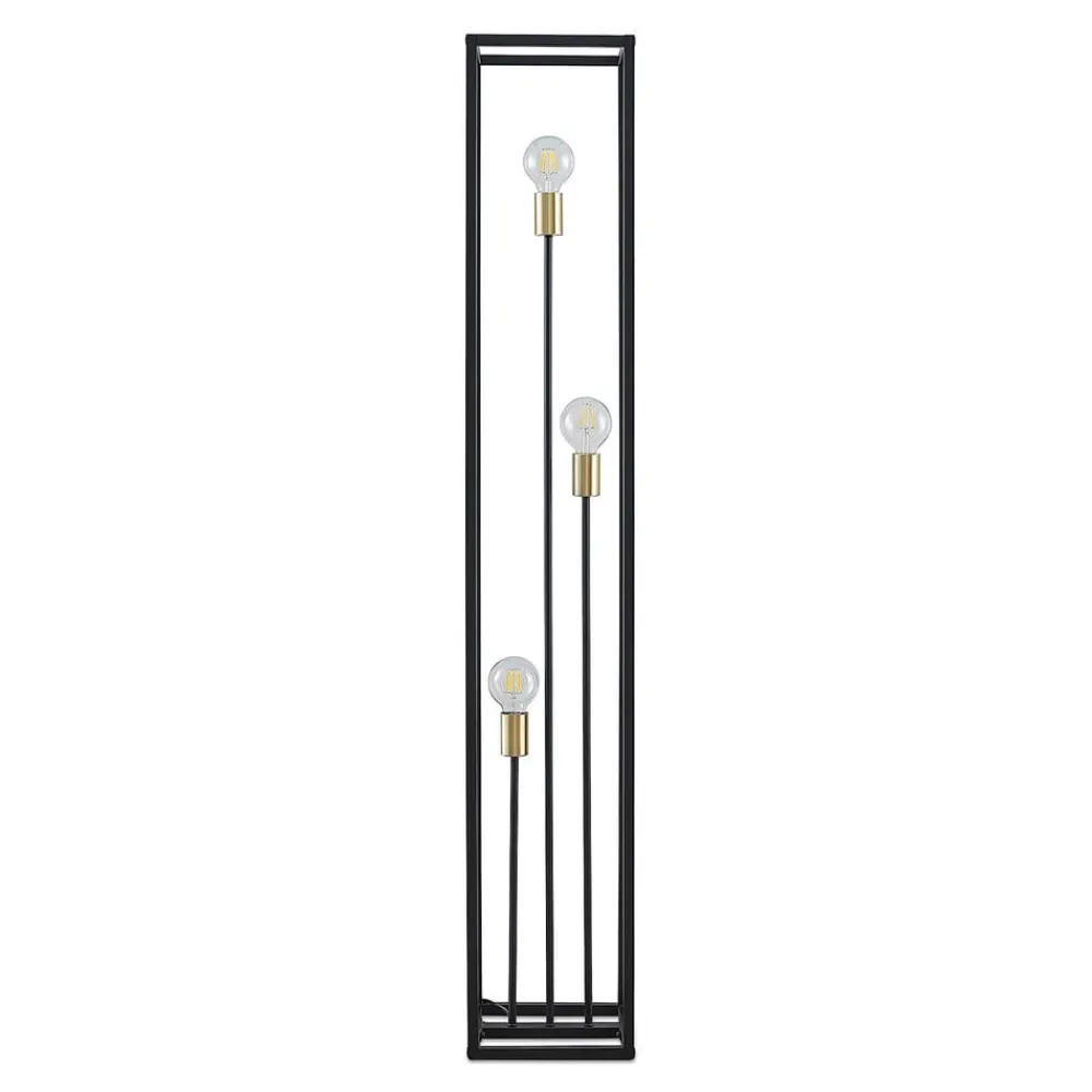 Kasseformet Tiliano-gulvlampe med tre fritt synlige E27-lyskilder Tiliano-gulvlampen er definitivt et severdig belysningsobjekt, som har lite til felles med klassiske representanter i sitt slag og i stedet representerer en moderne og designorientert belysningsløsning for oppholdsrom. I stedet for skjermer er det et rammeformet metallelement av matt svart jern, som har form som en kube og er helt åpen på alle sider. Inne i strukturen er det tre stenger, også svarte, som ender i forskjellige høyder og hver går over i en E27-fatning. Lamper kan velges etter ønske, men på grunn av deres gode synlighet og merkbare bidrag til det generelle utseendet, bør de ikke bare velges i henhold til tekniske aspekter, men også med tanke på deres utseende. Glødelamper eller rustikkpærer, som også fås med effektiv LED-teknologi, egner seg spesielt godt fordi utseendet imiterer klassiske gløde- eller kullglødelamper. En flott gulvlampe for et iøynefallende utseende i hele oppholdsrommet, som passer godt til moderne interiør med sine rette linjer, men som også kan utfylle visse vintage- og Scandi-stiler veldig godt!