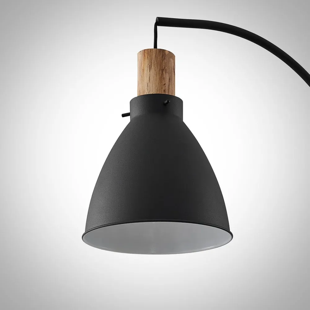 Trebale gulvlampe i matt svart metall med tredetaljer Den matt svartlakkerte Trebale gulvlampe er perfekt som leselampe ved siden av en lenestol eller sofa, ettersom skjermen er festet til stativet nedover og er hvitlakkert på innsiden slik at lyset reflekteres sterkt. Over skjermen er det festet et dekorativt element av eukalyptustre som gir hele armaturdesignen et spesielt preg og skaper en livlig kontrast til det svarte metallet. Gulvlampen Trebale er utstyrt med en fotbryter i den tekstilmantlede kabelen, og i skjermen er det en E27-fatning som er egnet for alle typer pærer.