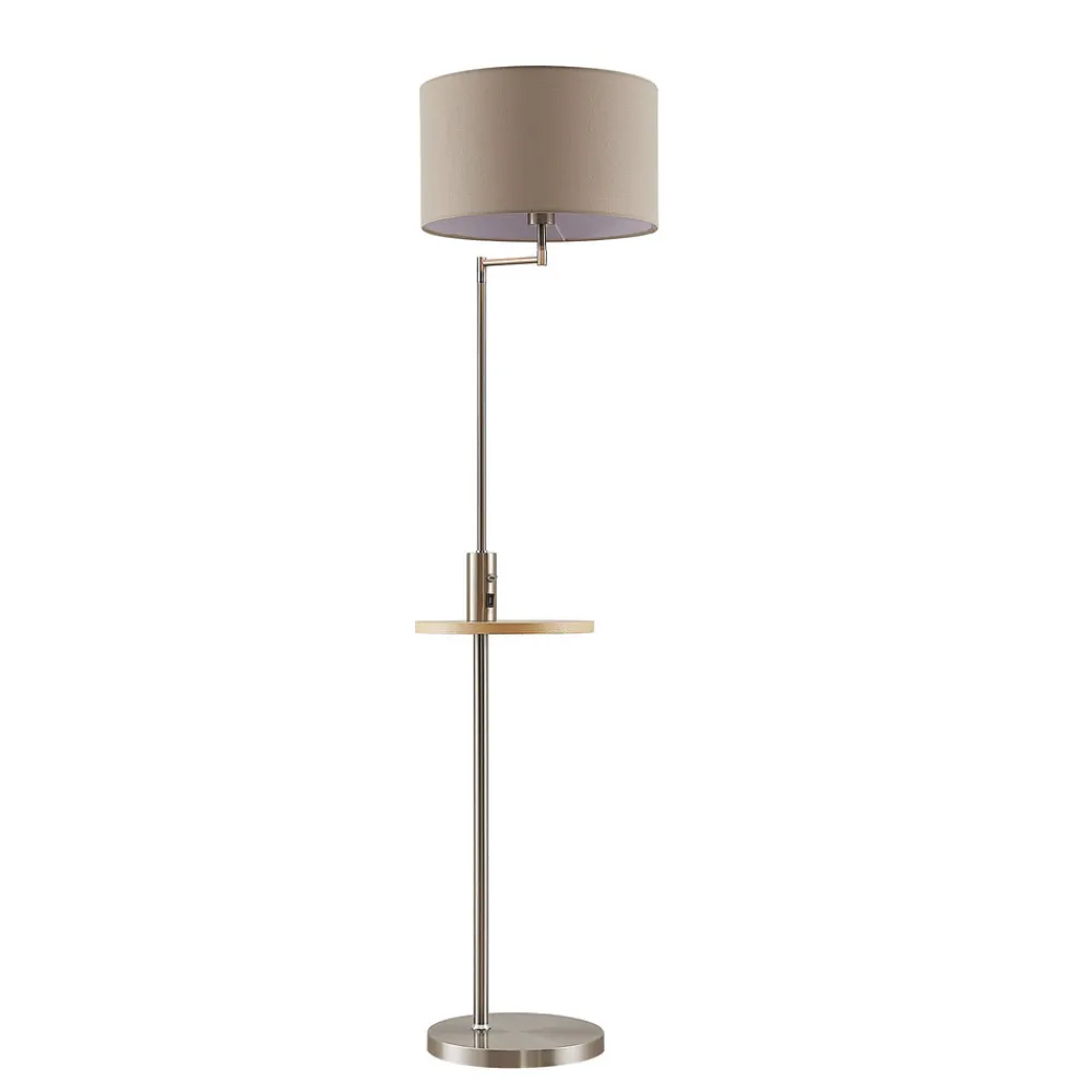 Zinia gulvlampe med hylle og USB-port Zinia gulvlampe overrasker med sin vellykkede kombinasjon av tre ulike materialer og sin egnethet til hverdagsbruk. Lampens ramme er laget av jern, mens den sylindriske lampeskjermen i beige er laget av rent tekstil. Det spesielle med denne lyskilden er den integrerte USB-porten og den praktiske hyllen på det nikkelfargede stativet. Hyllen er like rund og flat som lampefoten og er laget av lyst treverk. Helhetsinntrykket av lampen er minimalistisk og funksjonell på samme tid – Zinia er et vakkert tilskudd til enhver bolig.