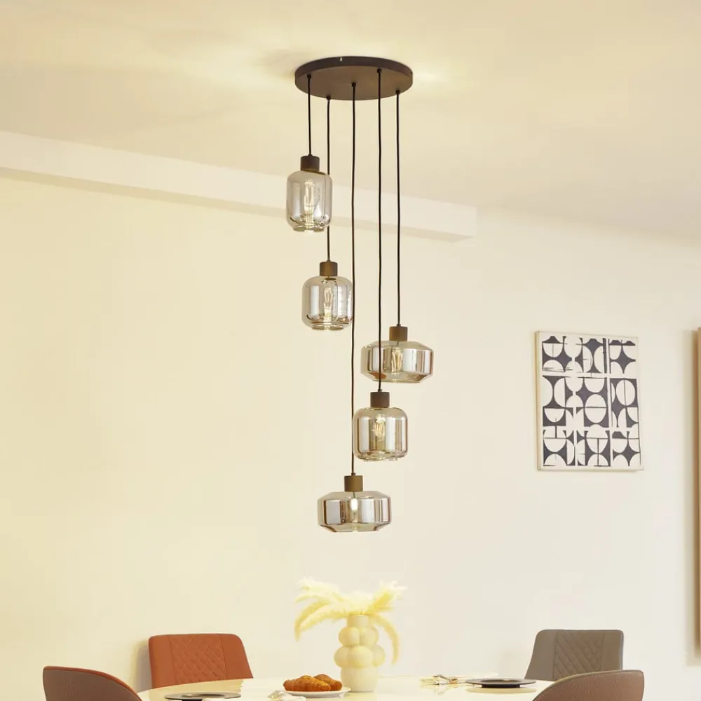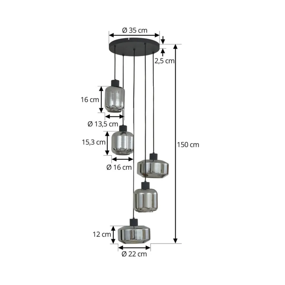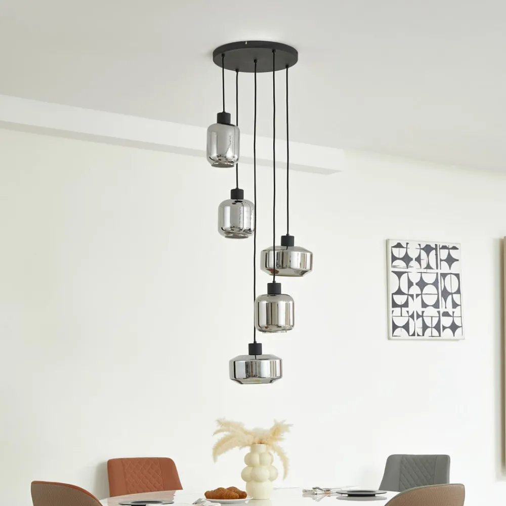 Røykgrå Hildur pendellampe med fem glasskjermer i ulike størrelser Hildur pendellampe, et mesterverk av moderne design, tilfører en ekstraordinær atmosfære til enhver stue eller spisestue. Med sine 5 lyskilder plassert i en rund oppstilling skaper den et harmonisk lysspill som er ideelt for både avslapping og sosialt samvær. Kombinasjonen av røykfarget glass og svart finish understreker den stilrene elegansen til dette belysningselementet. Selv om lampen ikke er utstyrt med en integrert dimmer, kan den enkelt kobles til en ekstern dimmer for å justere lysstyrken etter individuelle preferanser (vær oppmerksom på at den eksterne dimmeren må kjøpes separat).