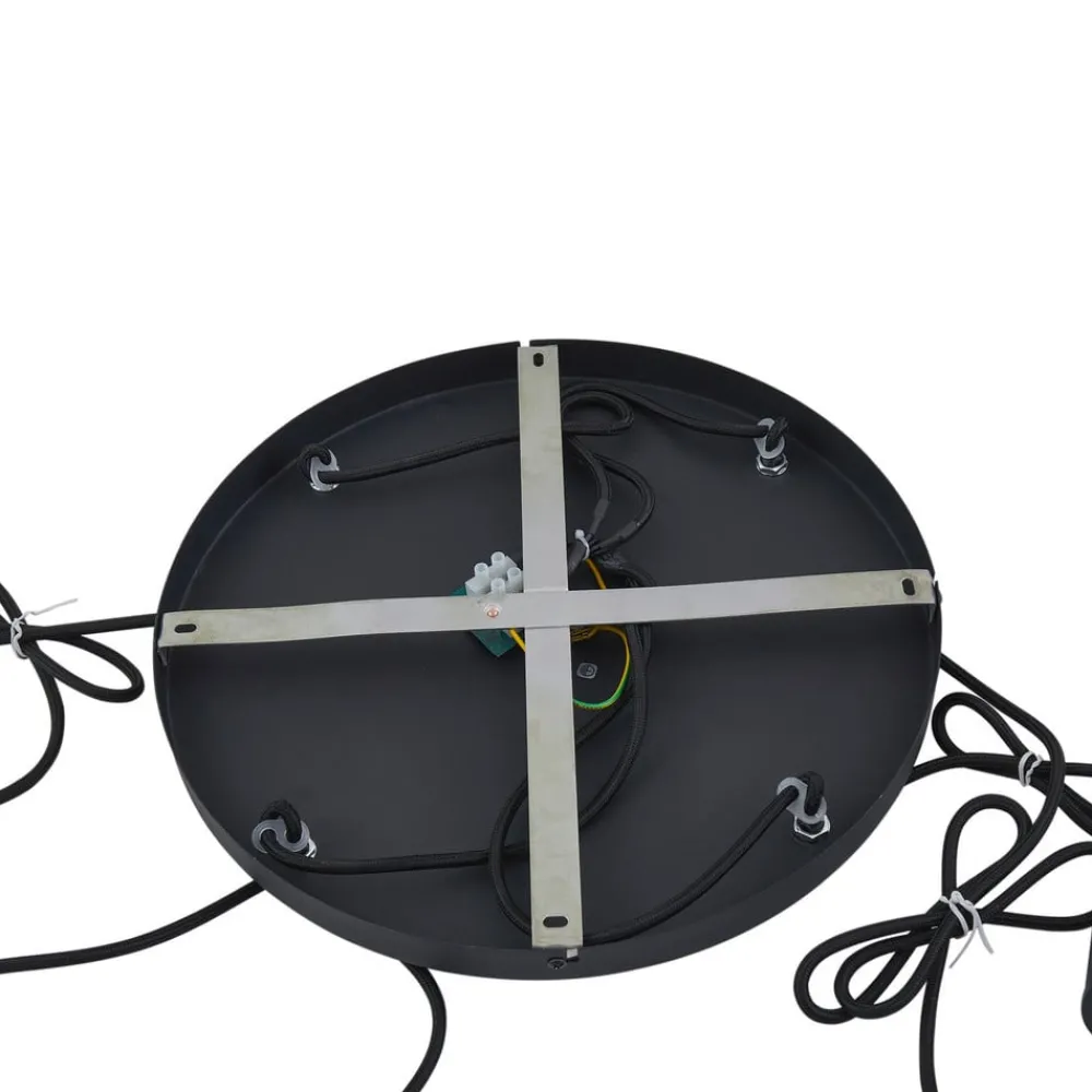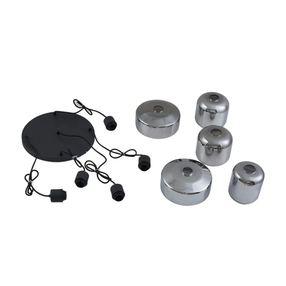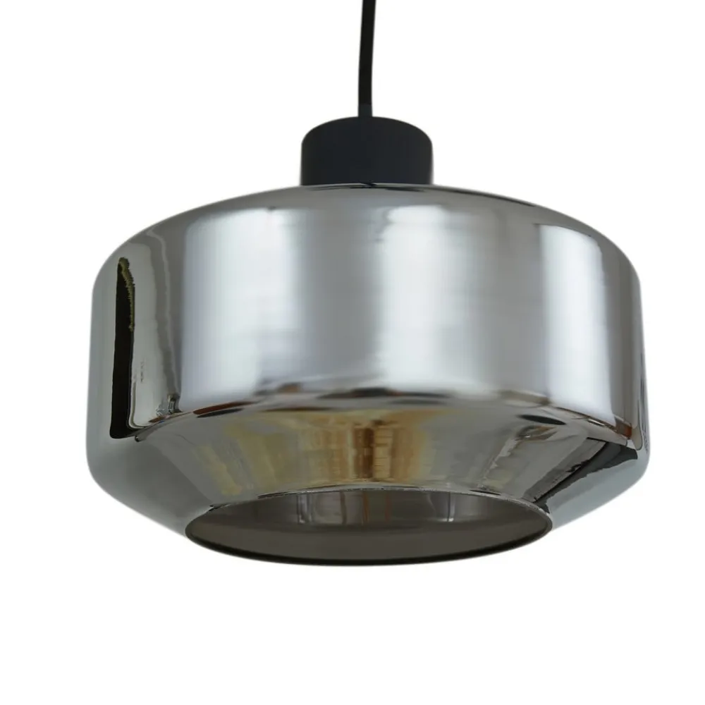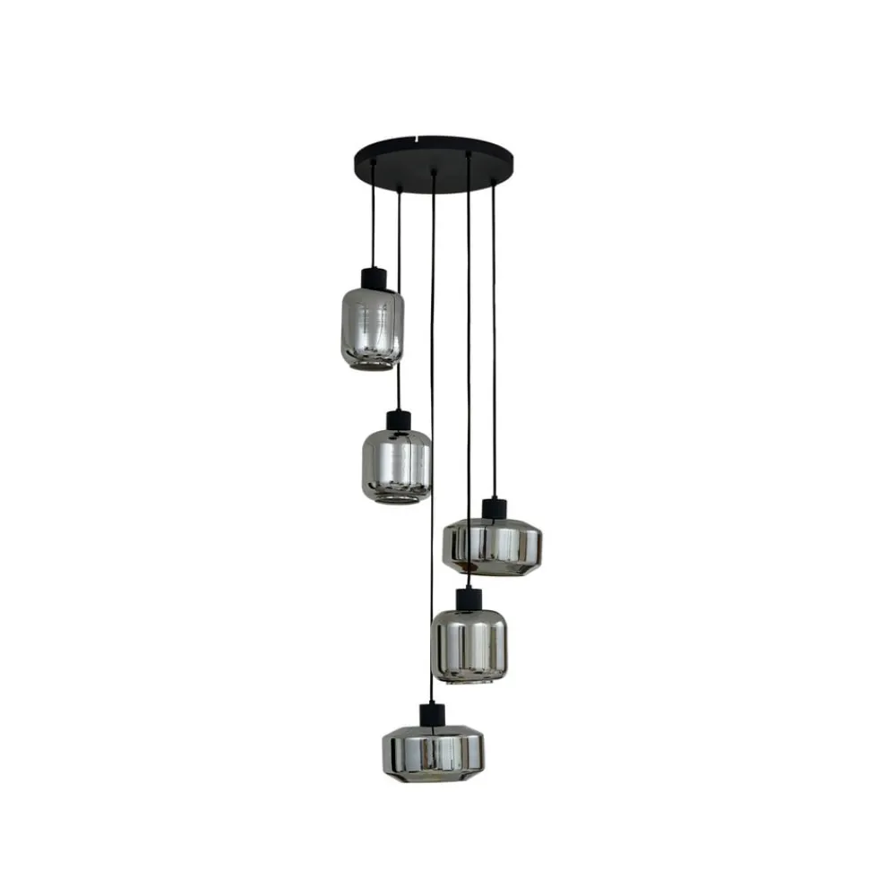 Røykgrå Hildur pendellampe med fem glasskjermer i ulike størrelser Hildur pendellampe, et mesterverk av moderne design, tilfører en ekstraordinær atmosfære til enhver stue eller spisestue. Med sine 5 lyskilder plassert i en rund oppstilling skaper den et harmonisk lysspill som er ideelt for både avslapping og sosialt samvær. Kombinasjonen av røykfarget glass og svart finish understreker den stilrene elegansen til dette belysningselementet. Selv om lampen ikke er utstyrt med en integrert dimmer, kan den enkelt kobles til en ekstern dimmer for å justere lysstyrken etter individuelle preferanser (vær oppmerksom på at den eksterne dimmeren må kjøpes separat).