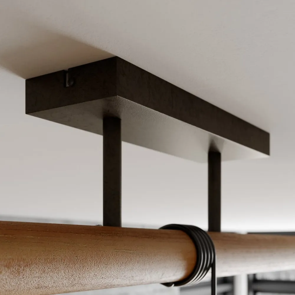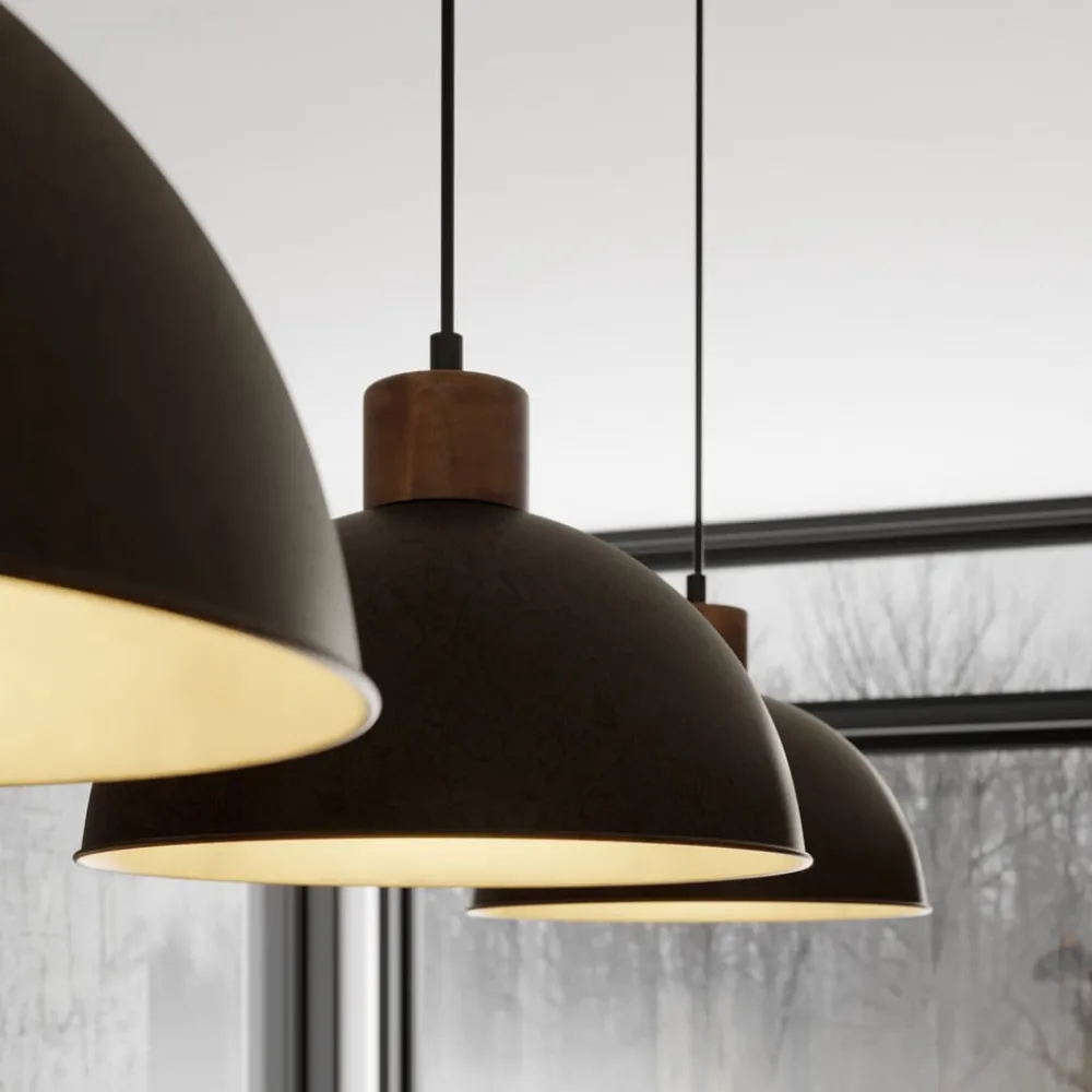 Holgar pendellampe med grå lampeskjermer – et ekte blikkfang Holgar pendellampen viser hvordan to materialer som ikke kunne vært mer forskjellige, kan kombineres perfekt. De grå lampeskjermene er laget av jern og festet til et treelement med tau. Metallet ser tungt og kjølig ut, mens treverket gir lampen et snev av naturlighet. Siden det ikke bare er to materialer som kombineres her, men også to stiler, kan armaturen tilpasses ulike boligkonsepter: Lampeskjermene har et moderne utseende og en trendy industriell design, mens treverket gir armaturen et rustikt element. Ettersom lampeskjermene er åpne i bunnen, klarer Holgar hengelampe å belyse overflater spesielt godt, noe som gjør den ideell å plassere over et spisebord.