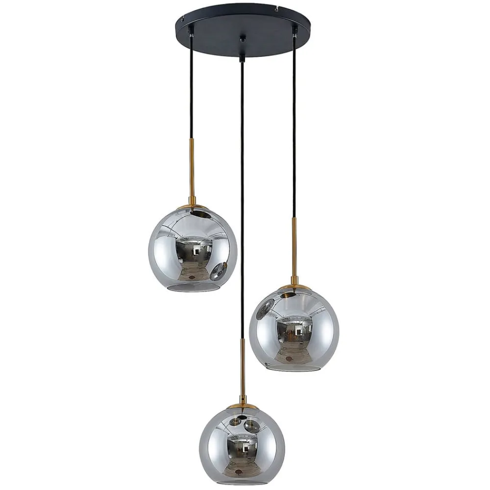 3 lyskilder Jurian pendellampe med røykgrå glasskjermer og bronsedetaljer Jurian har tre kuleformede skjermer i røykgrått glass som henger ned i rommet i ulike høyder. Dette skaper en lett og dynamisk effekt og gjør lampen ideell å montere over et bord i stuen eller spisestuen. Glassets røykgrå fargetone skaper et koselig lys og et elegant uttrykk, samtidig som pærene er godt synlige og derfor også bør velges av dekorative grunner. Detaljer i en vakker bronsetone gir et stilig preg til helheten, og vintage-møblementer kan også kombineres vakkert med denne pendellampen.