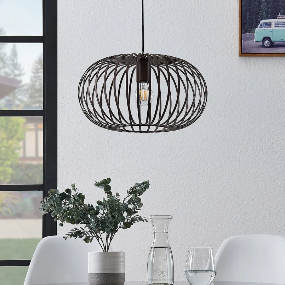 Nahele hengelampe i jern Grunnmaterialet i Nahele hengelampe er jern, noe som fremhever lampens rustikke karakter. For å understreke dette ytterligere er baldakinen, kabelen og burskjermen i fargen kaffebrun. Denne armaturen er perfekt for bruk av filamentpærer eller rustikke lamper, da gitterskjermen gir god oversikt over disse spesielle pærene. Streverne på skjermen kaster også en pen skygge på veggene. Skjermer av denne typen er helt up to date og ettertraktede belysningsobjekter.
